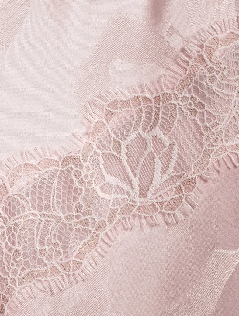 The Serita is back and flirtier than ever. This time, she arrives in a silk charmeuse jacquard fabric, giving it a drapey, yet elevated wear. The stunning slip dress features delicate contrasting lace at the neckline and waist. The lace is backed with a bit of chiffon for a seductive finish.
