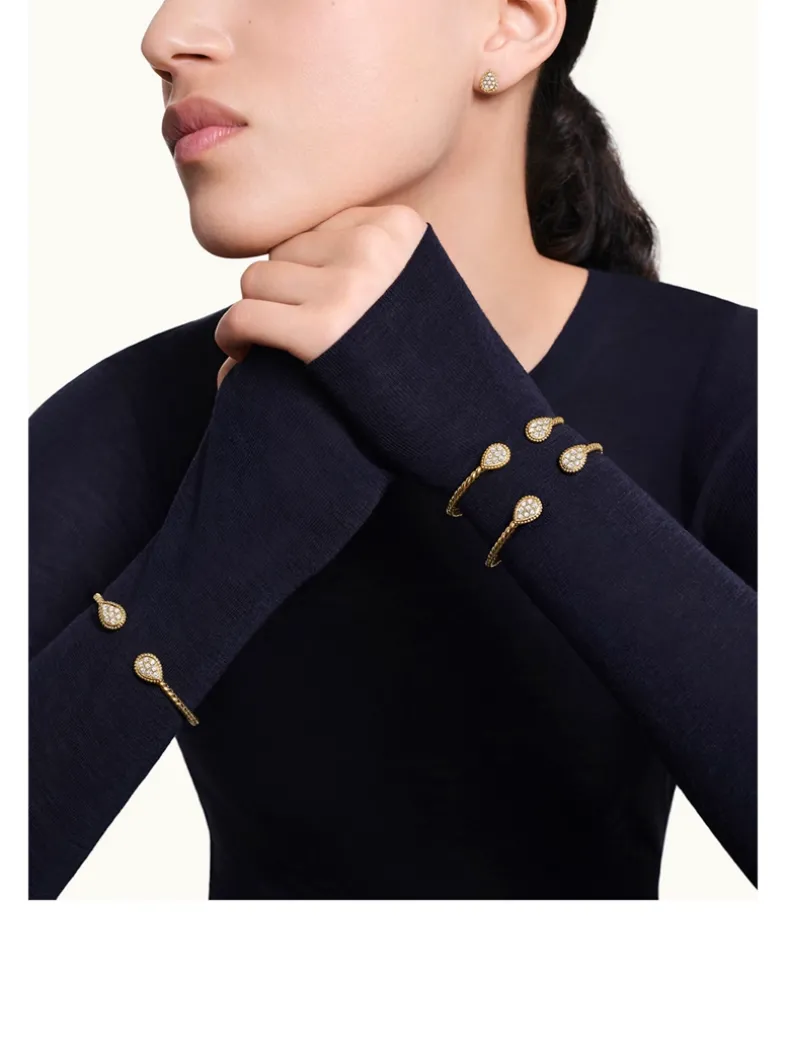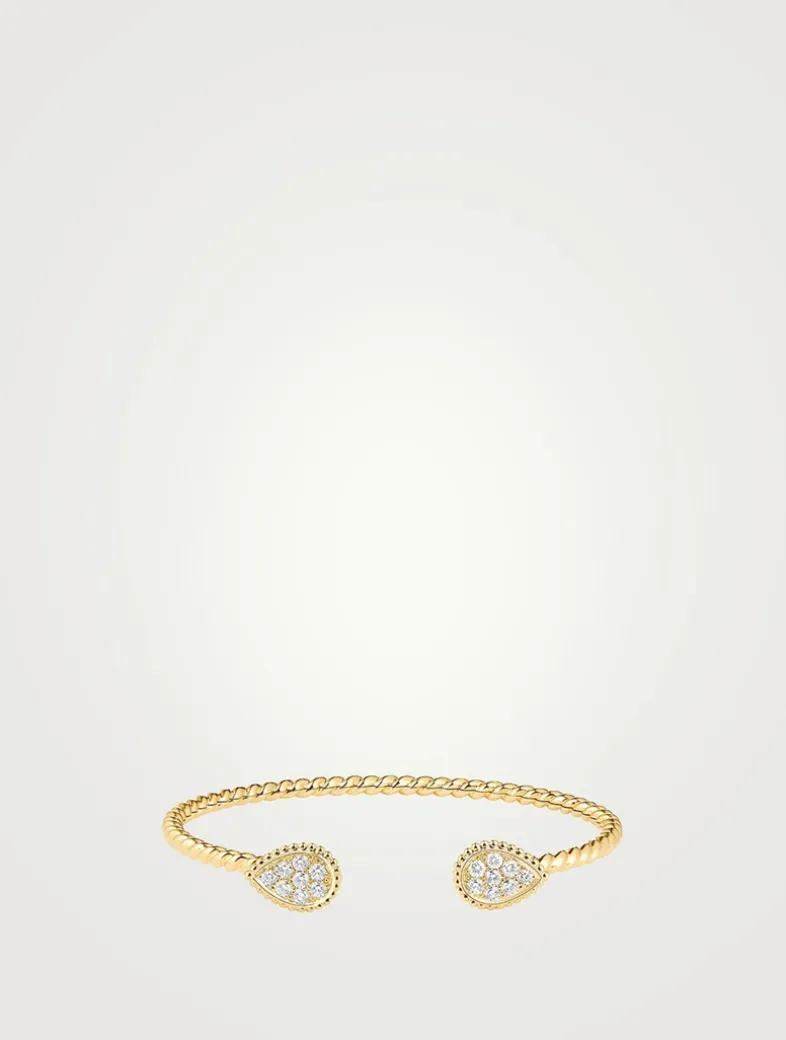This chain was sculpted in a twist and voluptuously curls around your wrist. This slightly open bangle was freed from its clasp and made delicately supple. Two diamond-paved drops top both its ends.