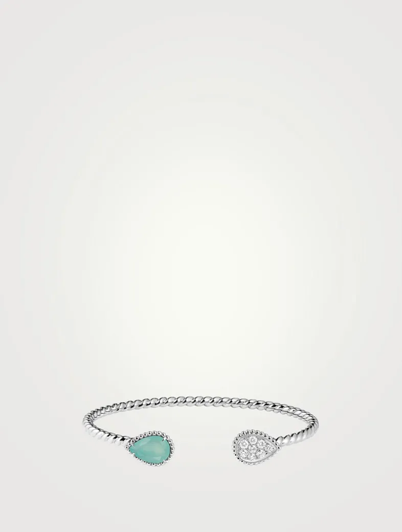 A drop of blue-green and a drop of diamonds, both surrounded by white gold beads. Each is placed as if balancing the other at either end of the twisted bangle, which slides effortlessly onto the wrist.