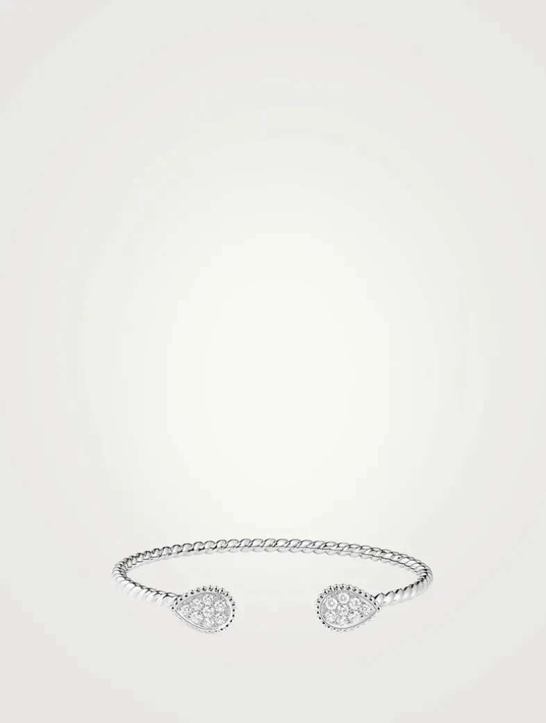 A twisted sculpted chain wraps voluptuously around the wrist. And here is a slightly open bangle bracelet, released from its clasp and delicately flexible, on which come to deposit two drops paved with diamonds.