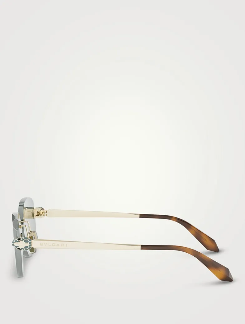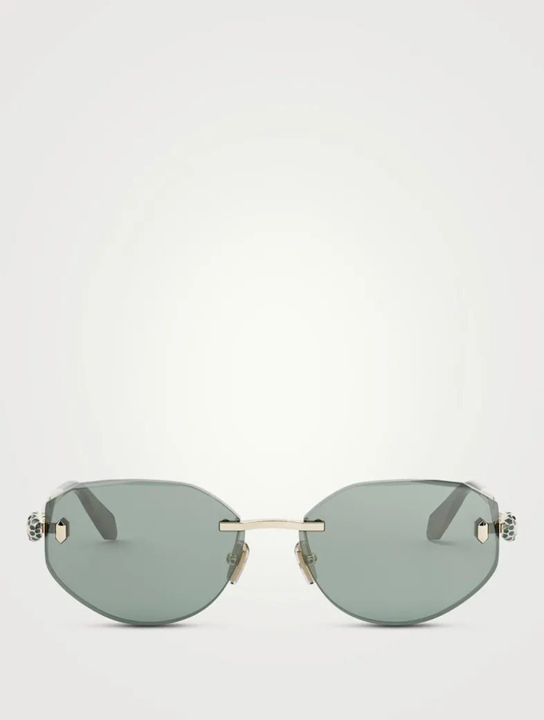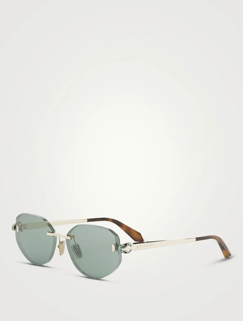 These cat-eye sunglasses feature a rimless front shape with iconic snake-head detailing on the temples, embodying a timeless Serpenti Forever style, complete with a lasered logo on both the metal temples and the lens.