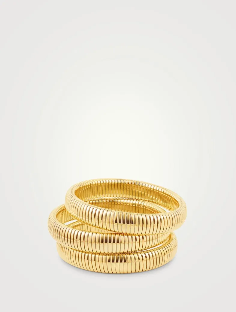 Presented in a set of three, these 100% nickel-free and cadmium-free bracelets are designed from a thick, snake chain textured metal bracelets. Made from 14K gold-plated brass, the bracelets are waterproof and tarnish resistant. Finished with an e-coating which qualifies it to pass waterproof tests. Luv Aj uses Ion Plating, which is a Physical Vapor Deposition (PVD) process used to create durable, long-lasting finishes on metal.