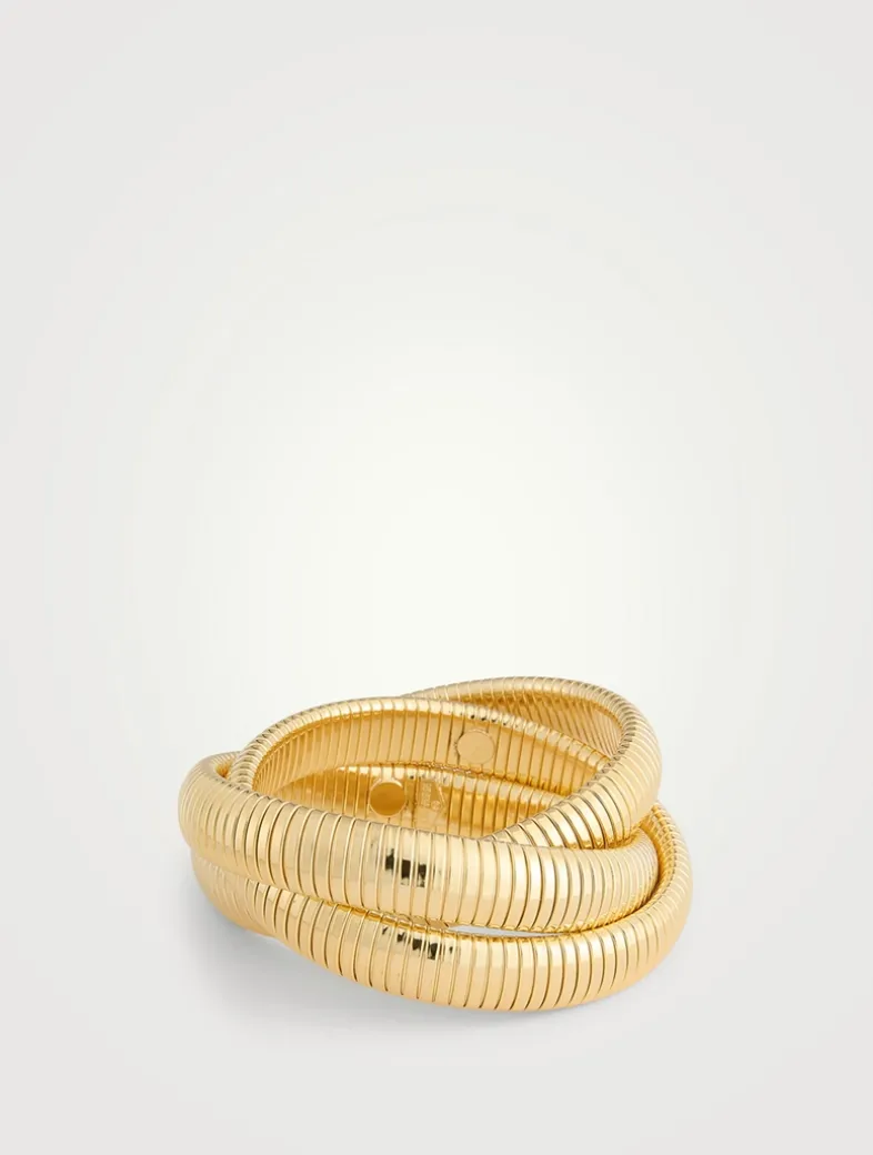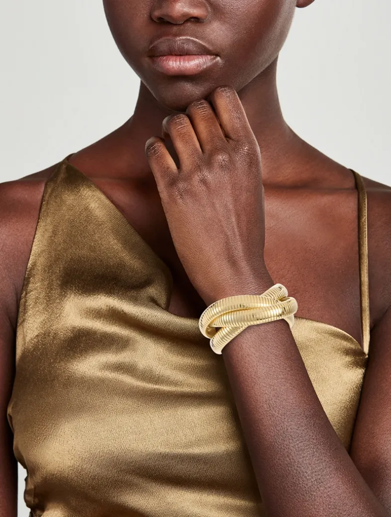 From the Cleopatra collection. All presented in a golden finish, this set of three twisted snake bracelets is designed for stacking.