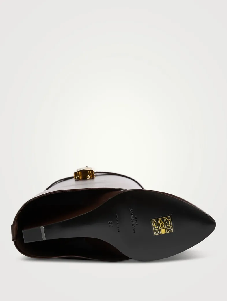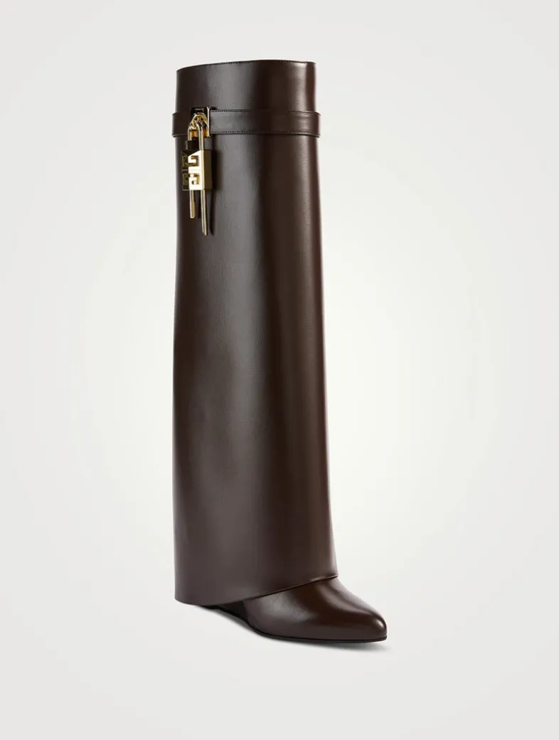 Part of Givenchy’s iconic Shark Lock line, these boots are crafted in smooth calfskin leather and set on a wedge heel. A leather band around the shaft features a branded metal clasp and 4G padlock on the right side and branded padlock on the left one.