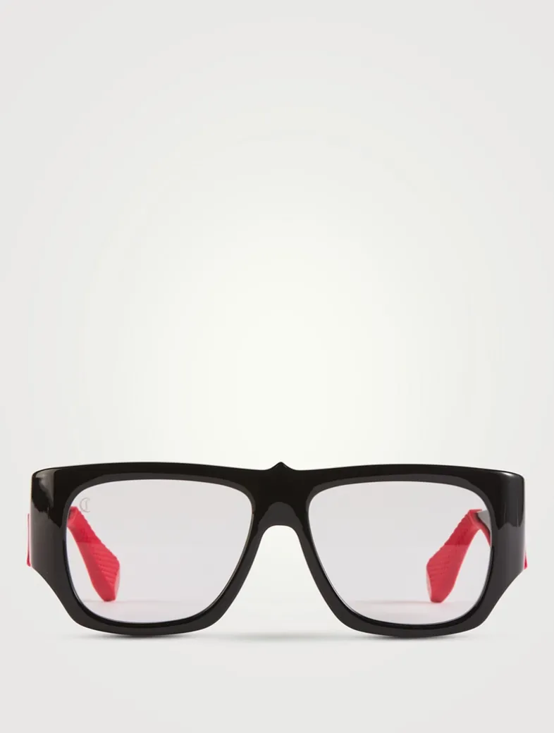 These square sunglasses rework the codes of Maison Louboutins iconic Loubishark with its signature wavy pattern. The graphic arms evoke sharks’ teeth and end in textured temple tips. Zeiss lenses offer exceptional comfort and durability.
