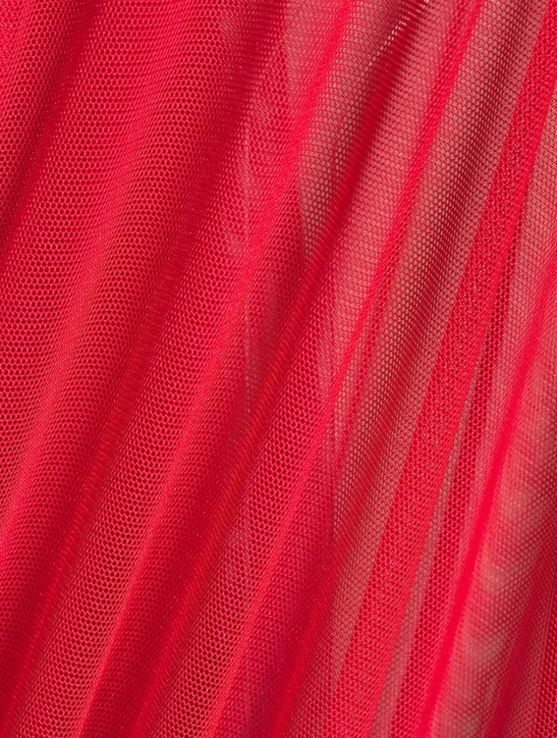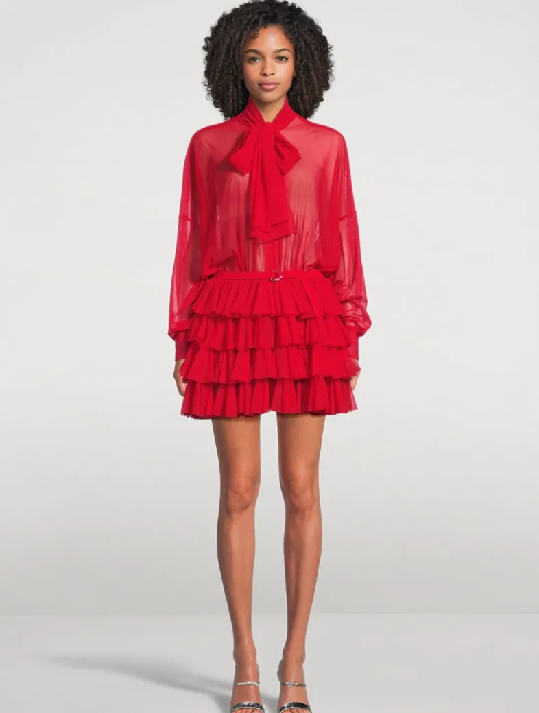 Flaunting a semi-sheer finish, this mini dress has long sleeves and a high neckline accented with a pussybow detail. It has a ruffled skirt cinched with a slim D-ring belt.