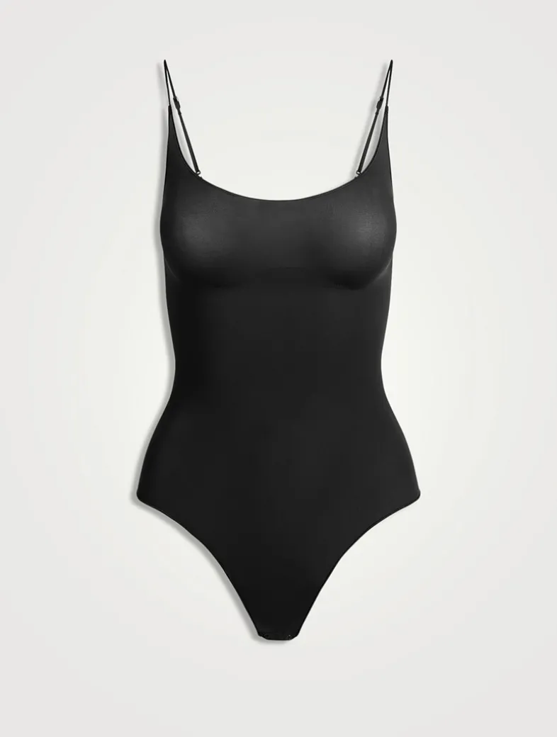 Summer-ready support. This scoopneck, thong bodysuit is designed in SKIMS’ lightweight, smoothing fabric for mid-level compression at the core. The perfect warm weather layer, this sheer solution is designed with thin, adjustable straps. Complete with snaps at the gusset and fits true to size.