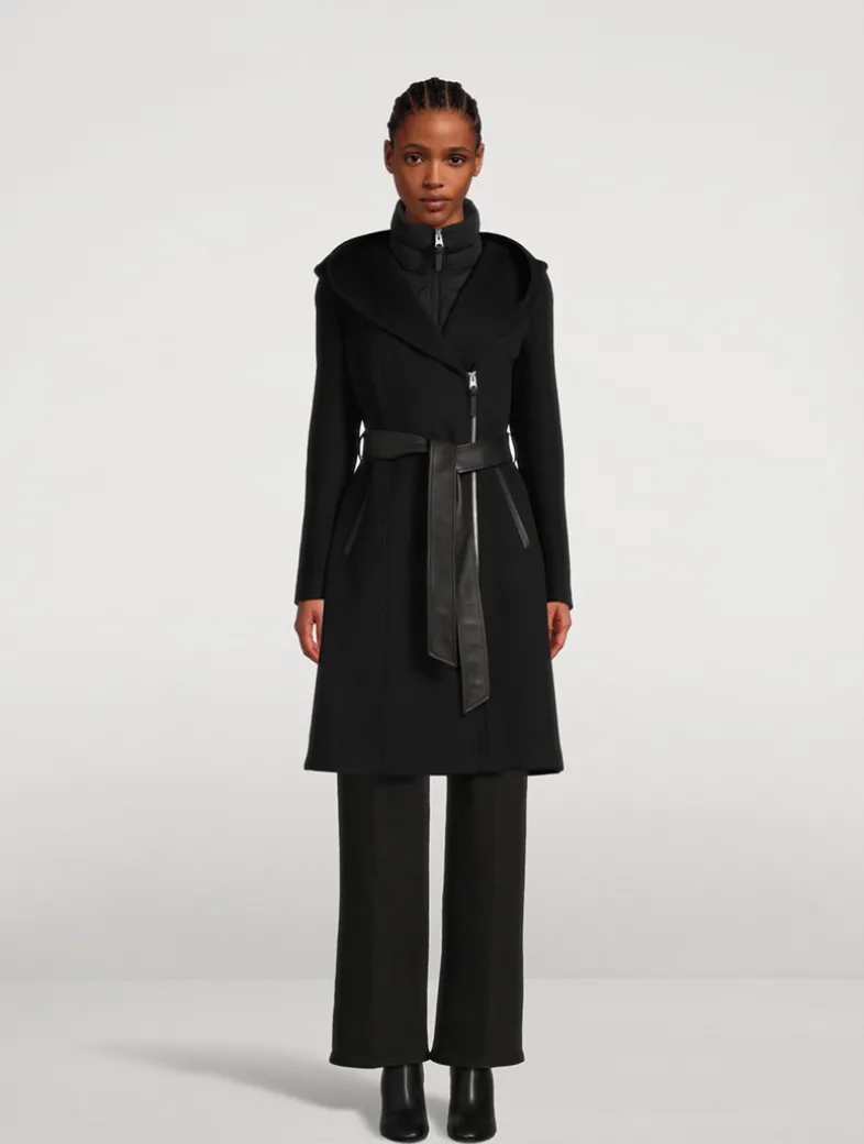 Shia is a two-in-one coat featuring the signature Mackage hood with a removable stretch light recycled down bib with stand collar. Expertly crafted with double-face wool, a shell and leather sash belt accentuate the fitted asymmetrical zip front. Mixed-media details and leather welts add elegant edge. Certified to the Responsible Wool Standard (RWS).