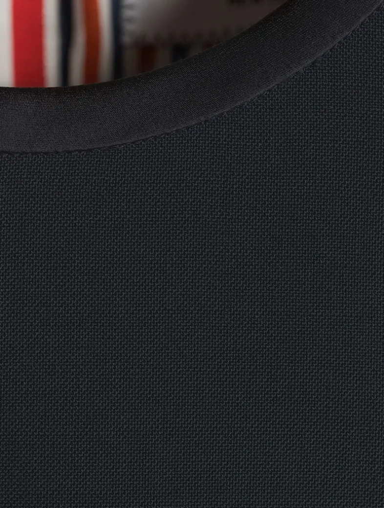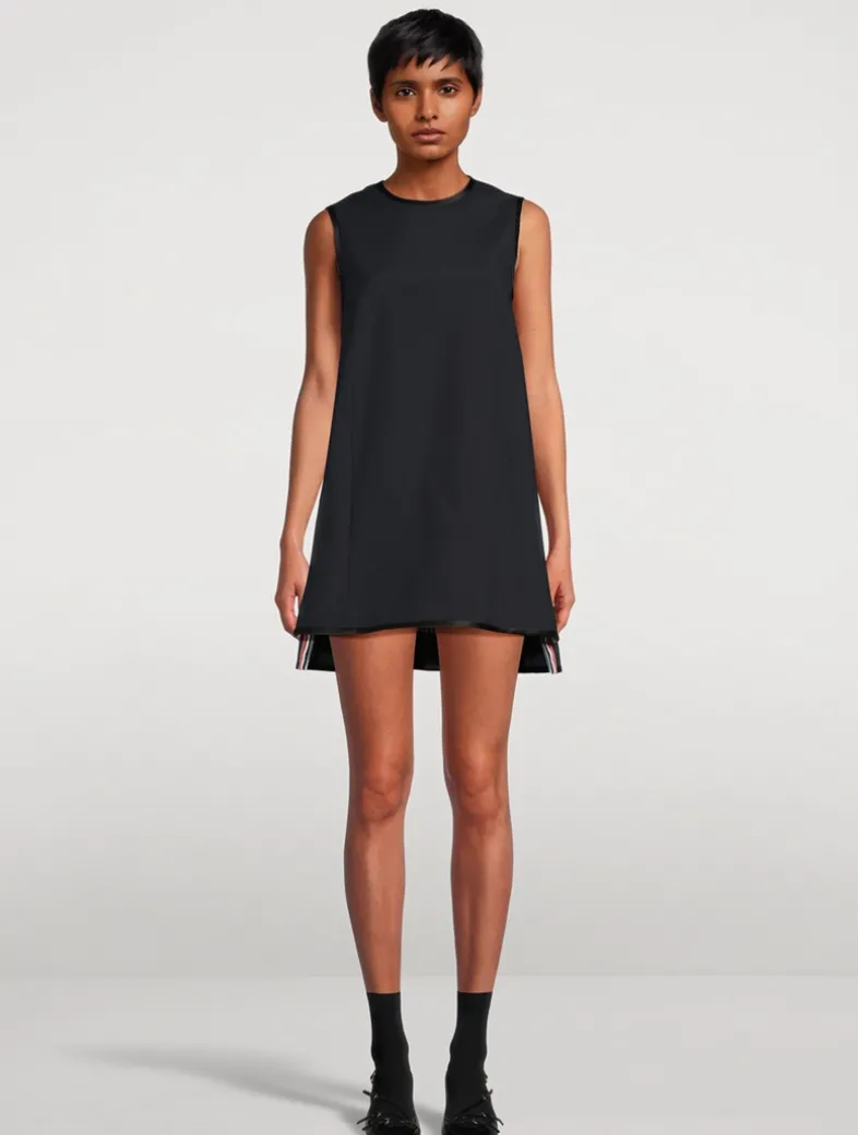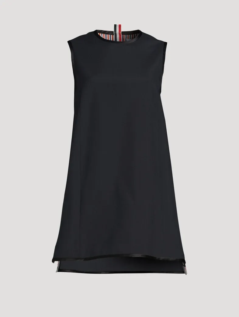Made from a wool blend, this chic mini nods to school uniform-inspired styles. It is cut in a sleeveless shift silhouette and has a high-low hem edged with striped silk trim.