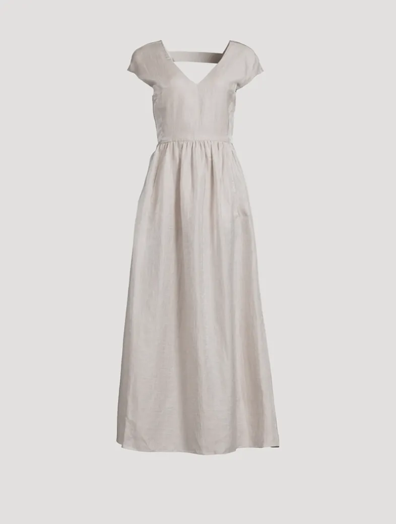 This floor-grazing dress with a V neck, short sleeves, and two practical side pockets, is made of a crisp linen blend with a shiny finish that adds a natural sheen to the piece. The skirt with pleats creates movement and a signature cut-out detail at the back elevates the sophisticated nature of the style.