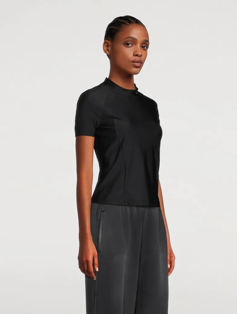 Logo detailing at the neckline defines this athletic rash guard, accentuated by body-contouring seams and a stretch construction.