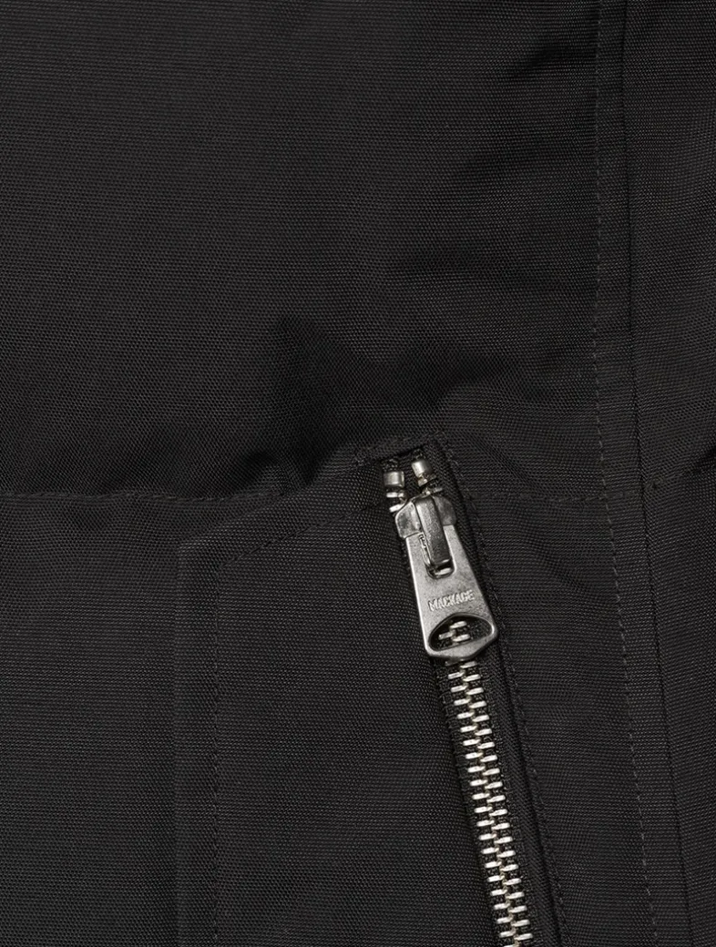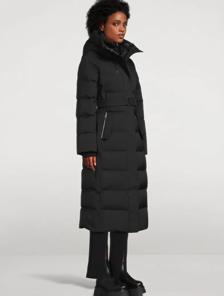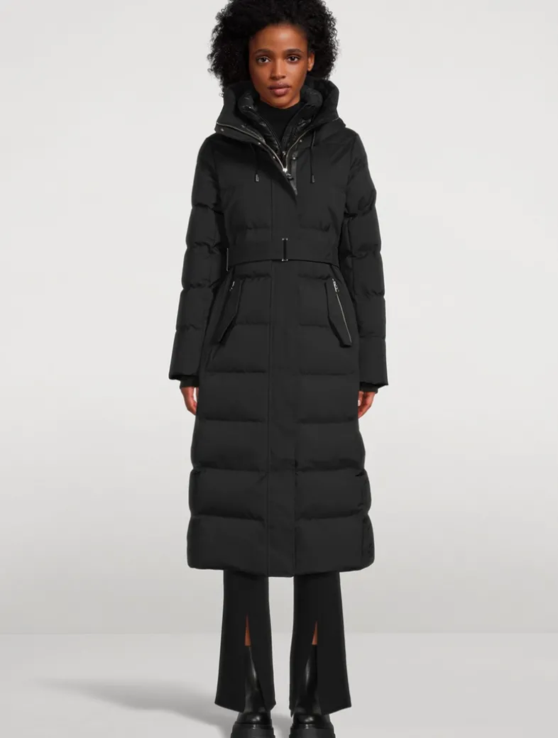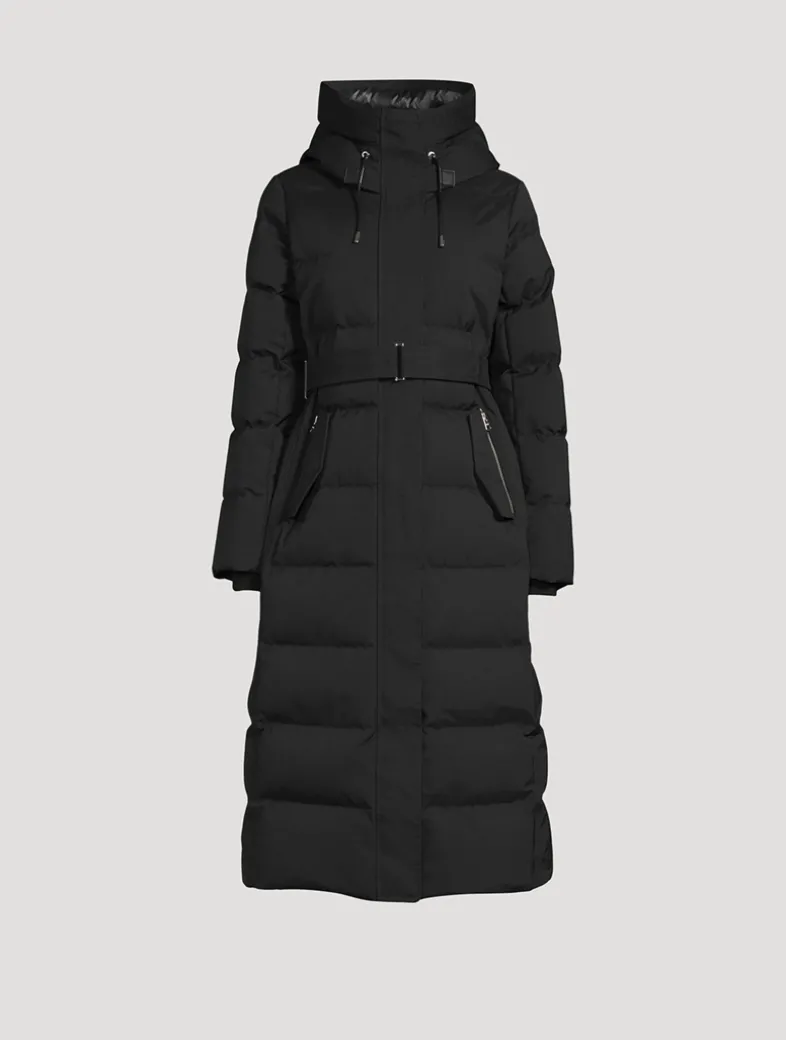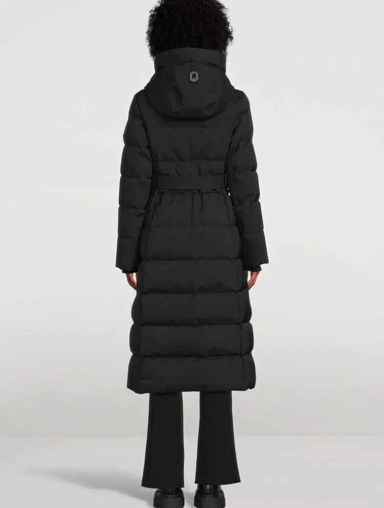 Cut with a 2-in-1 longline silhouette, this semi-fitted down coat is enhanced with a removable lustrous down bib and adjustable storm visor hood. Featuring the signature proprietary Nordic Tech weave, this water resistant and repellent jacket is detailed with a removable branded belt and hidden drawcord waist. Finished with leather detailing, storm cuffs, and 800 fill power. Temperature rating: Arctic rated: Down to -25°C.