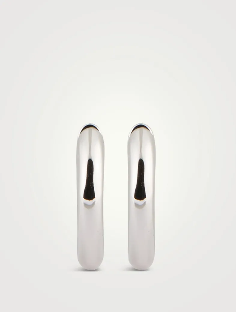 This pair of chunky metal huggie hoops are coated for lasting durability and plated in high polish rhodium for maximum shine. The huggie snap closure offers comfortable everyday wear. Earrings are 100% nickel-free and cadmium-free. E-coating ensures jewellery is waterproof and tarnish-proof.