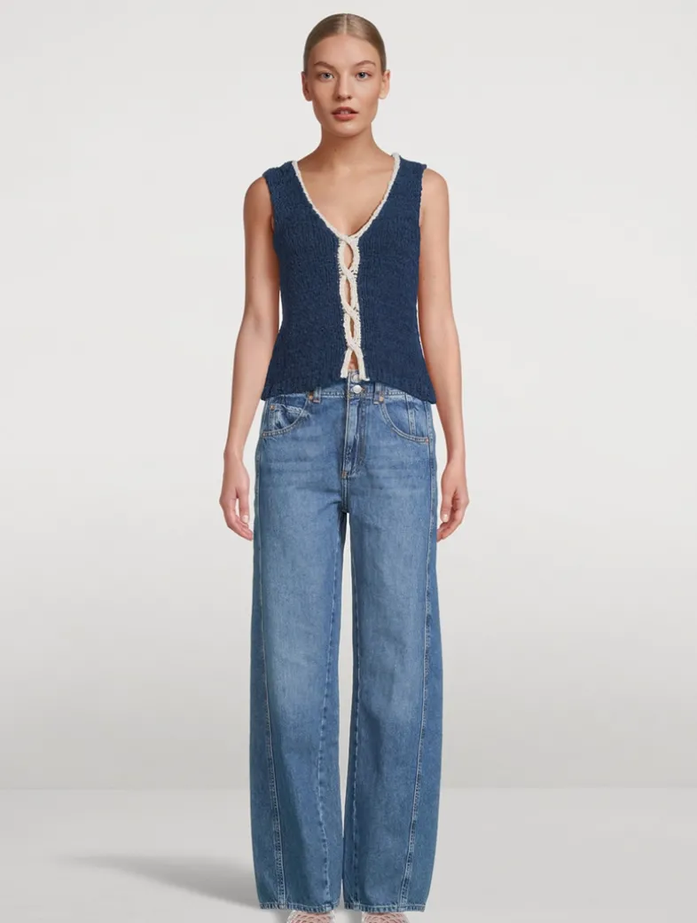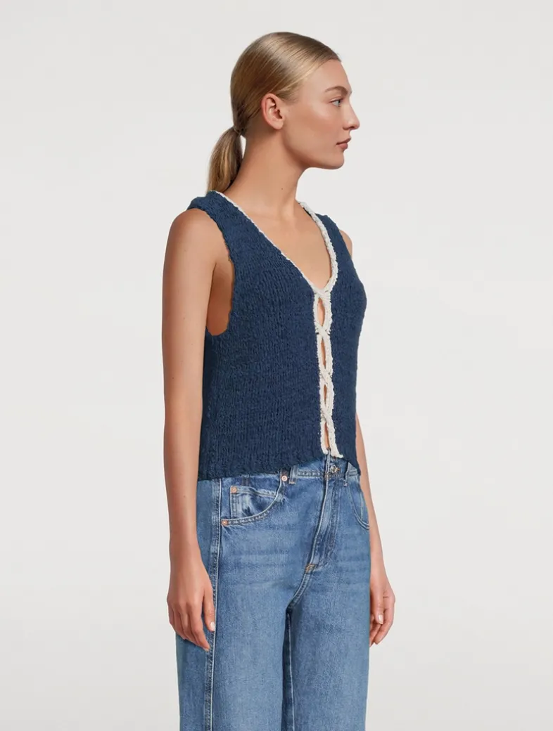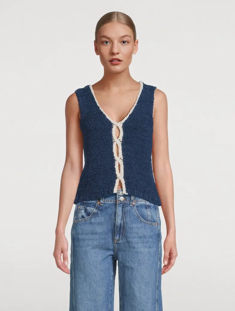 This sleeveless sweater, featured in a reversible silhouette, is detailed with contrasting twist detail at front for the perfect dimensional touch. Knit from a cotton blend, it has a slightly cropped silhouette with dropped armholes and a V-neckline that can be worn facing the back.