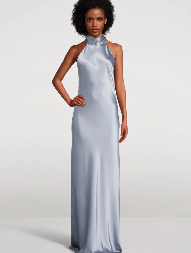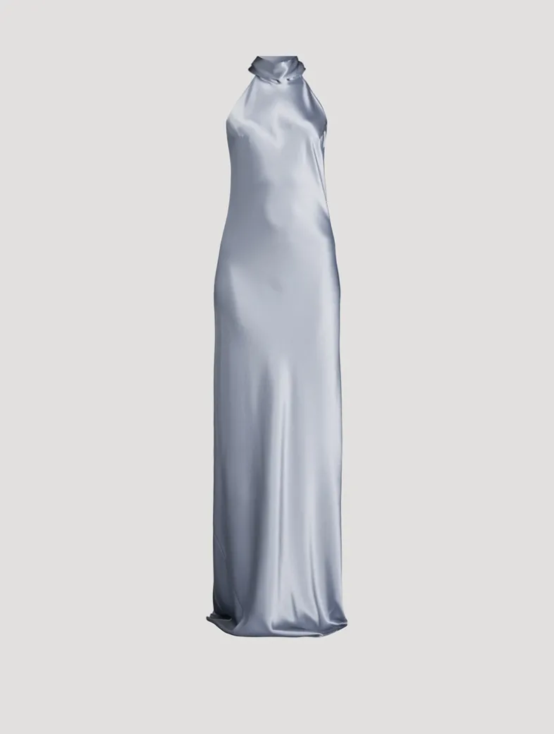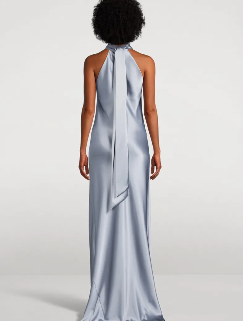 An elegant high neckline and sash-tie detail that drapes down the back, coupled with draped bias-cut satin, defines this elegant gown.