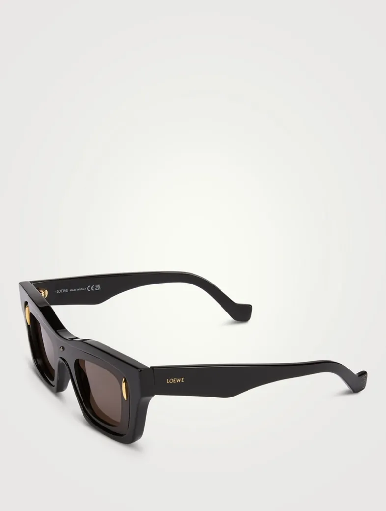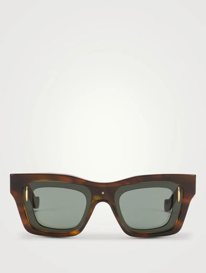 Characterized by thick, square rims, these bold sunglasses are enhanced with gold metal stitches on the sides and a tone-on-tone screw in the middle of the frame.