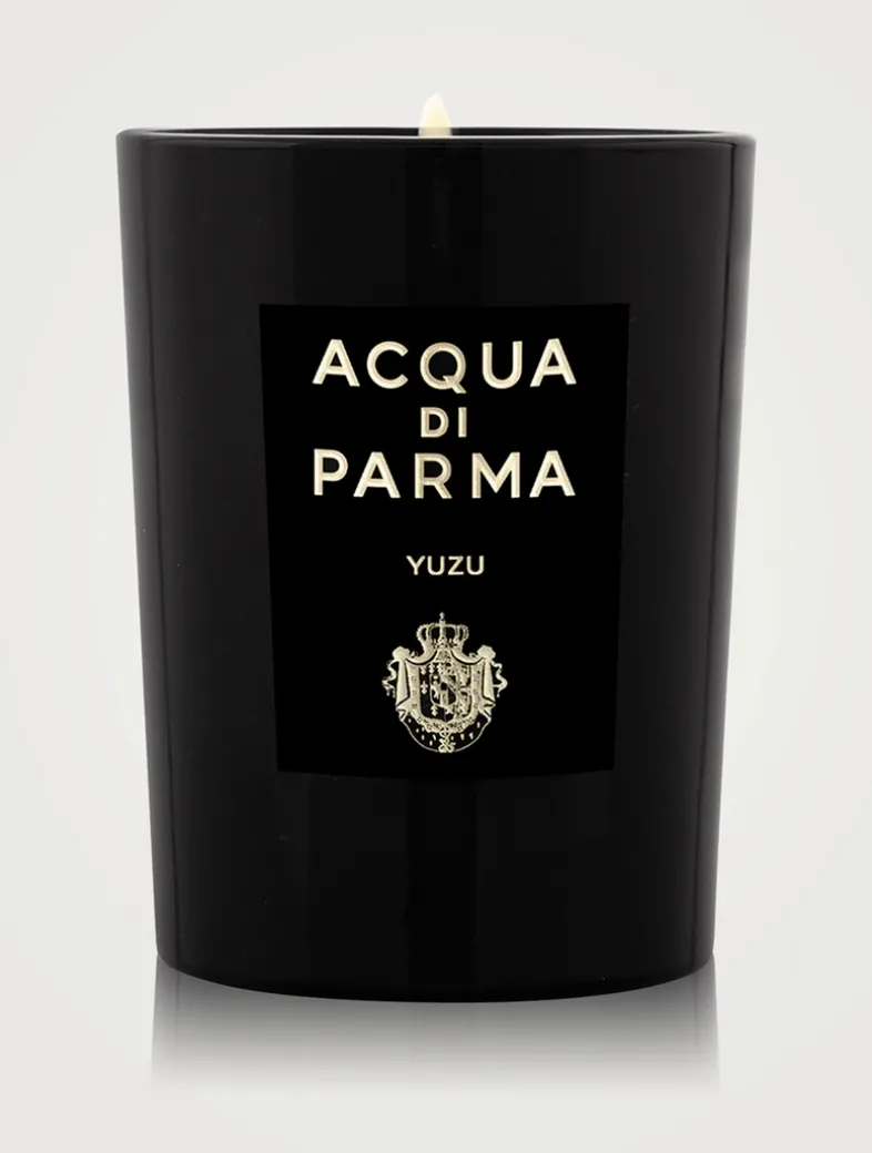 With notes that sparkle in citrus brightness, the Yuzu candle is an embodiment of Signatures of The Sun’s art of perfume that brings the prism of the sun to a poignant expression of the golden Yuzu fruit. Crafted from white vegetable wax and set in a shiny black lacquered glass jar, the candle diffuses the fresh and vibrant fragrance notes of Yuzu across the home. Part of the Home Collection, the scented candle sets a sparkling and energising atmosphere of original harmony that gives off all its light as never before. The 200g candle comes in a foldable outer pack made from black FSC paper featuring a luxurious black matte label with hot gold foil embossed Acqua di Parma logo. The scented candle comes in a glass jar reminiscent of the Maison’s iconic Art Deco bottle in its signature black shade.
