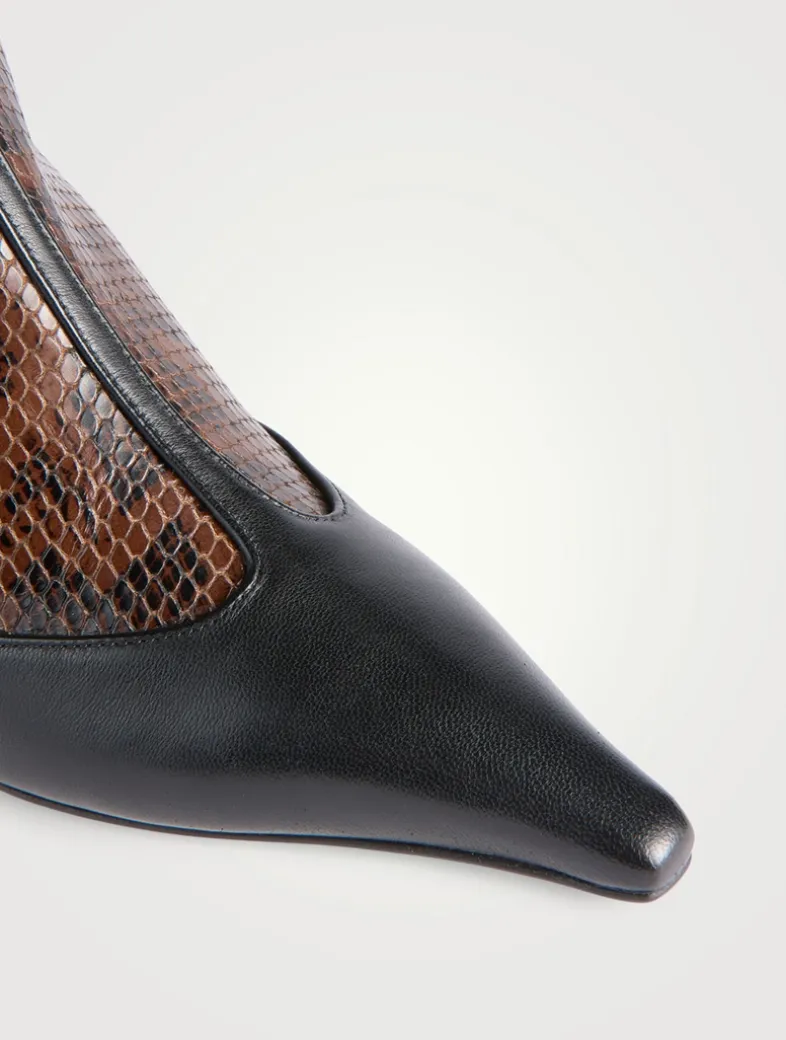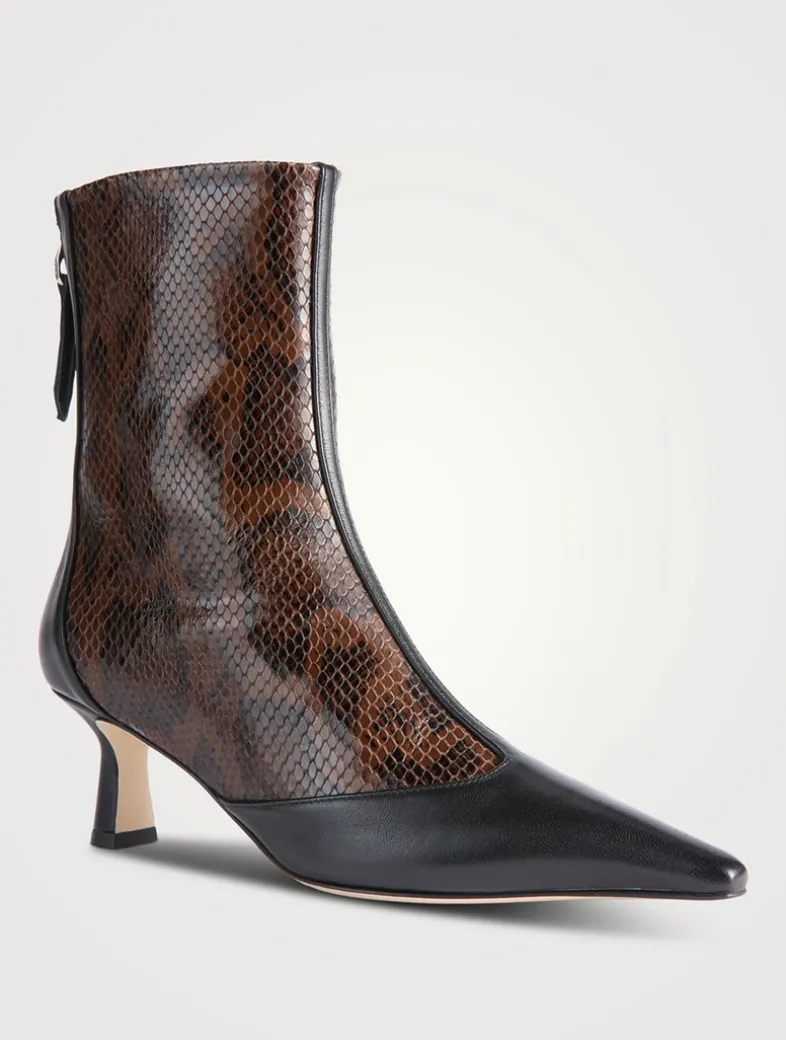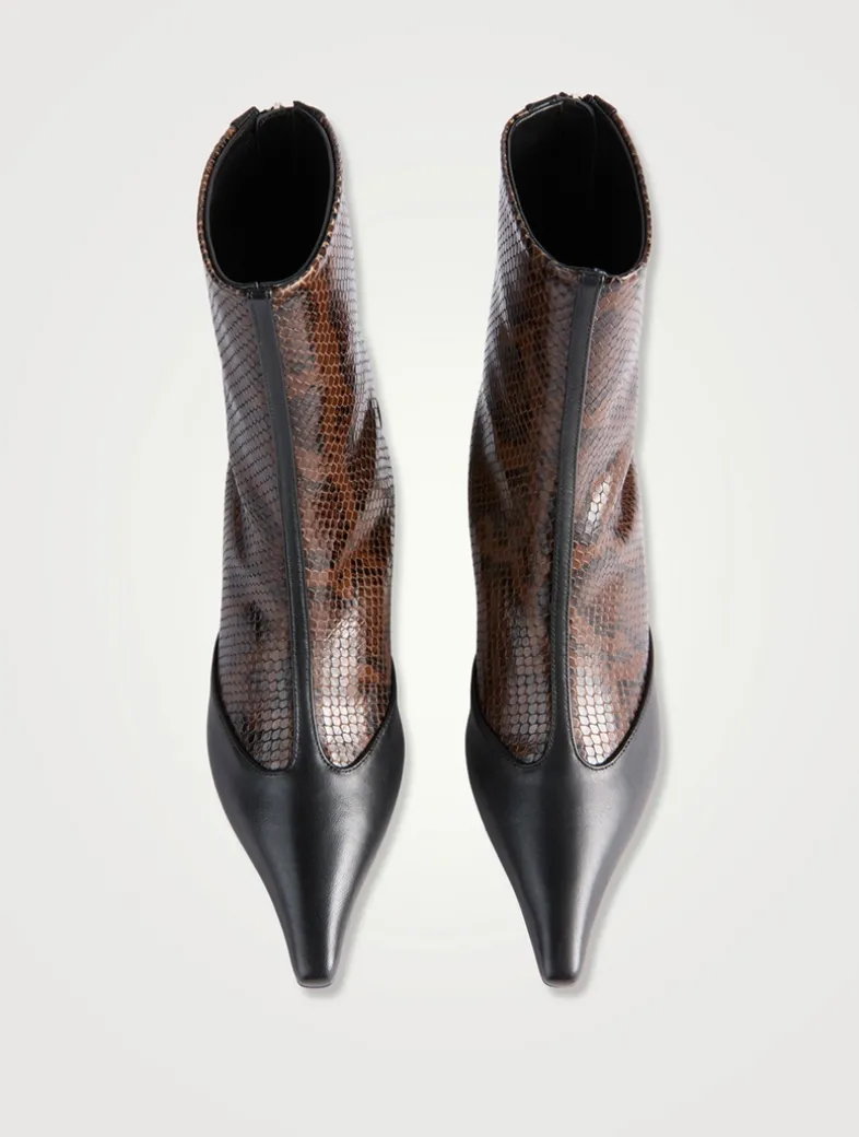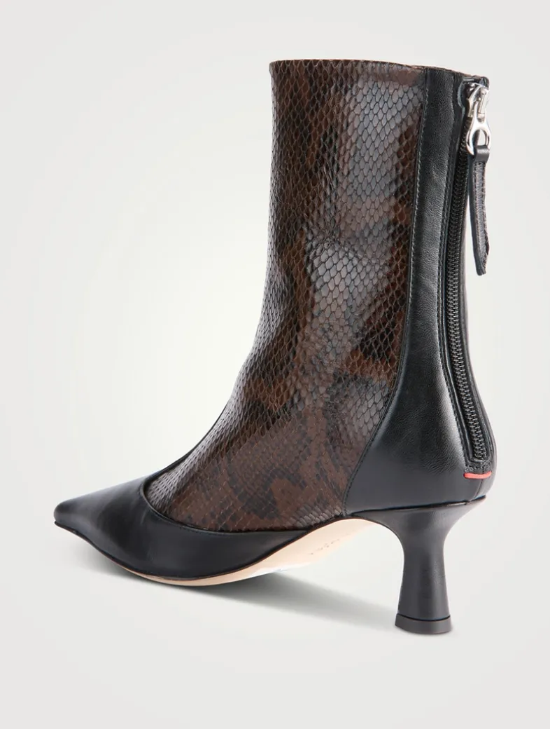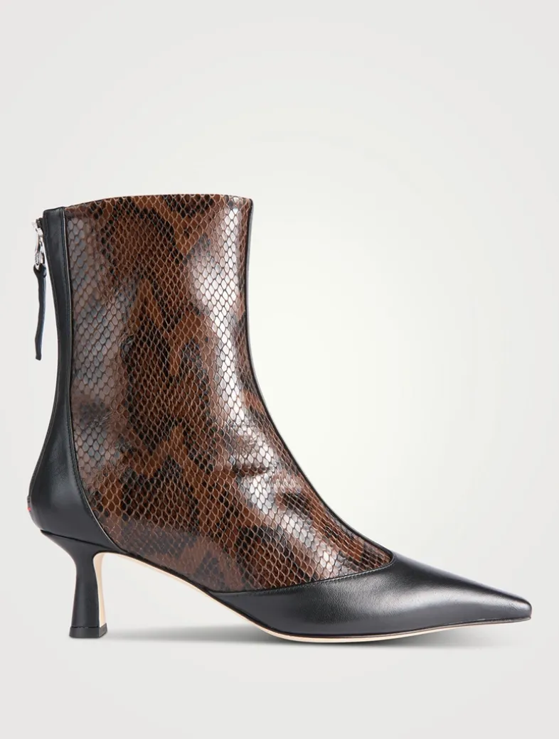 Sila is the pointed-toe ankle boot defined by a T-Bar detail, lifted by a slim kitten heel, and finished with layered details that nod to trompe l’oeil techniques. Aeyde footwear is made in Italy with generations of leather-specialist knowledge in family-run factories.