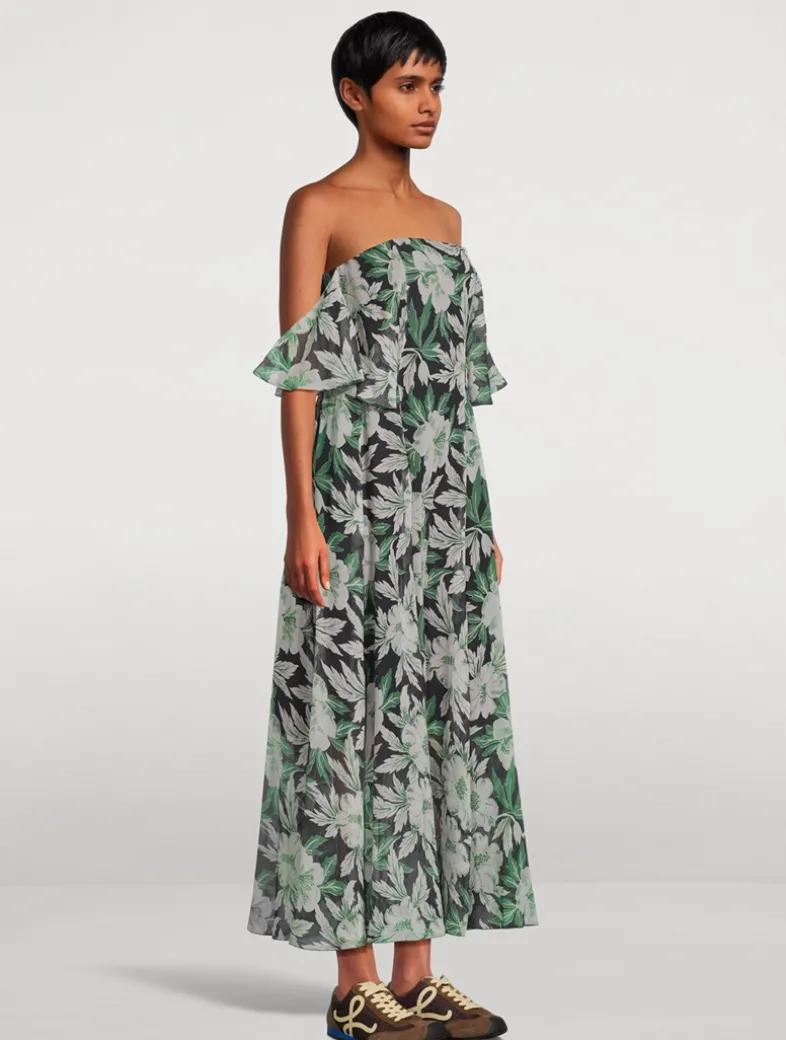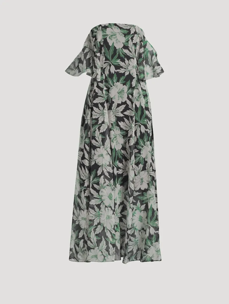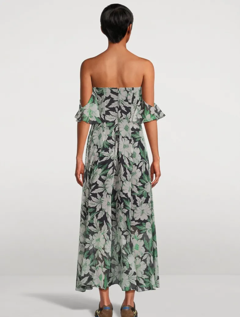 Crafted in Italy from lightweight silk crepon, this elegant dress features a bustier construction with off-the-shoulder sleeves. Fully lined and embellished with an allover hibiscus print.