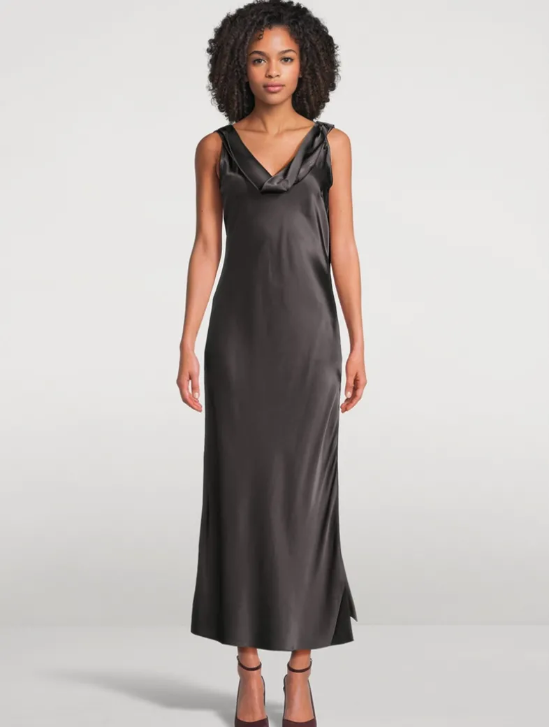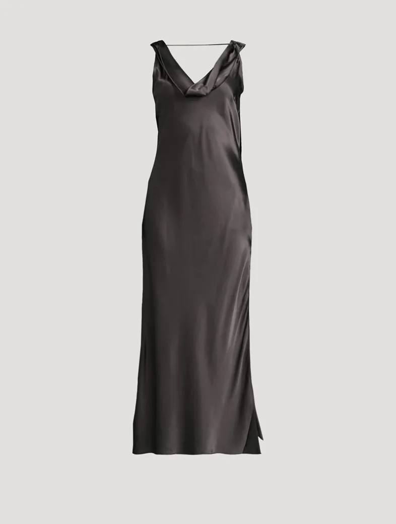 This sleeveless dress is crafted from lightweight draped silk, featuring a built-in scarf detail and a front slit.