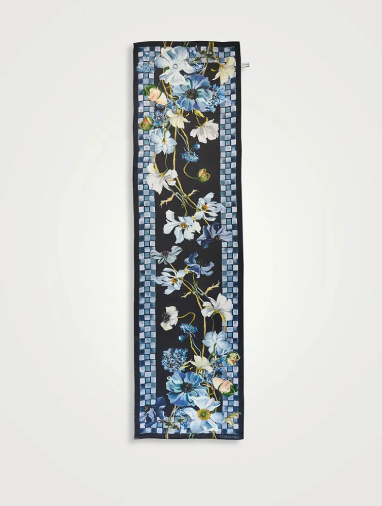 Inspired by a vibrant oil painting, this luxe pure silk scarf features a delicate floral print set against a softly shaded backdrop, framed by intricate mosaic-effect borders.