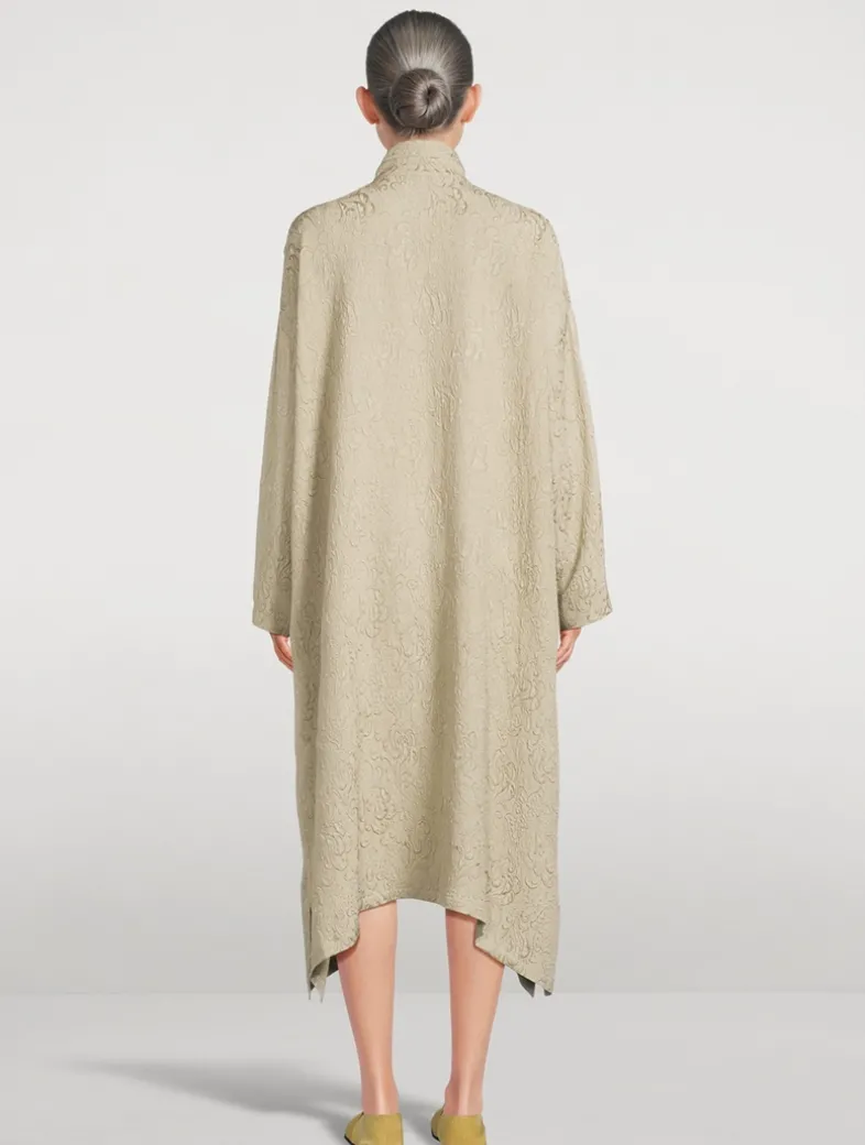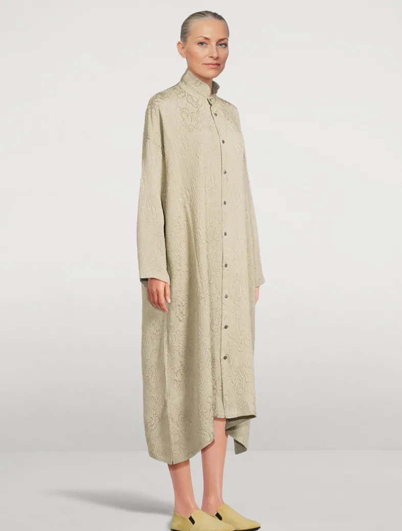 A damask cloqué silk construction lends a luxe touch to this shirt dress. Topped with a banded collar, it has long sleeves, a buttoned closure, and slits at the mid-calf hem.