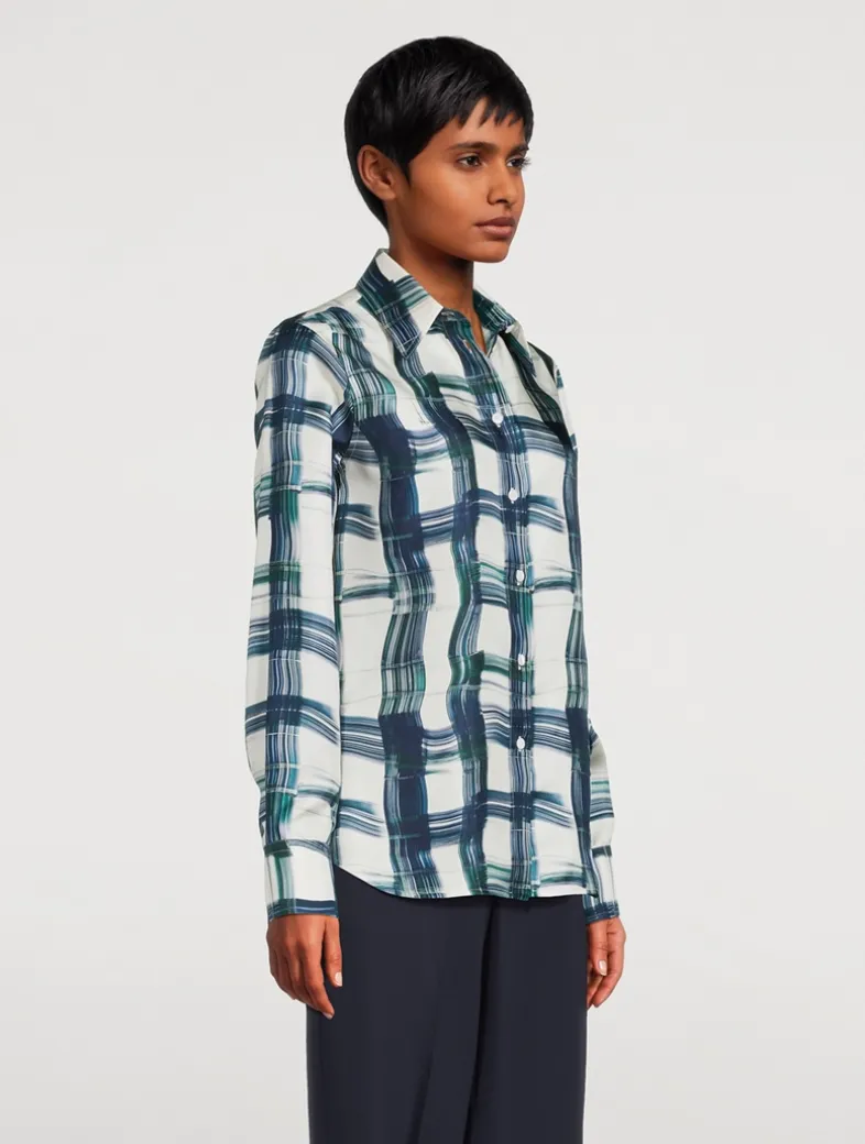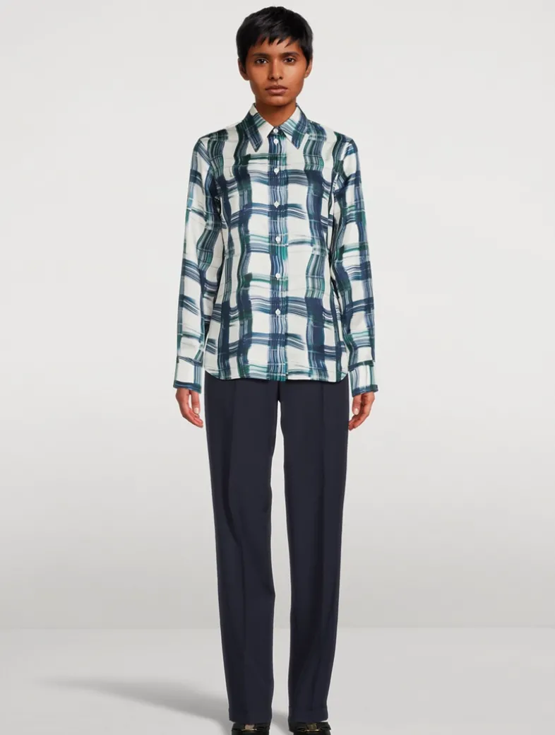 The silk shirt is printed with a maxi tartan motif with brush stroke effect. Following the lines of masculine tailoring, the cut is straight, with a back yoke and a straight fit on the bust.