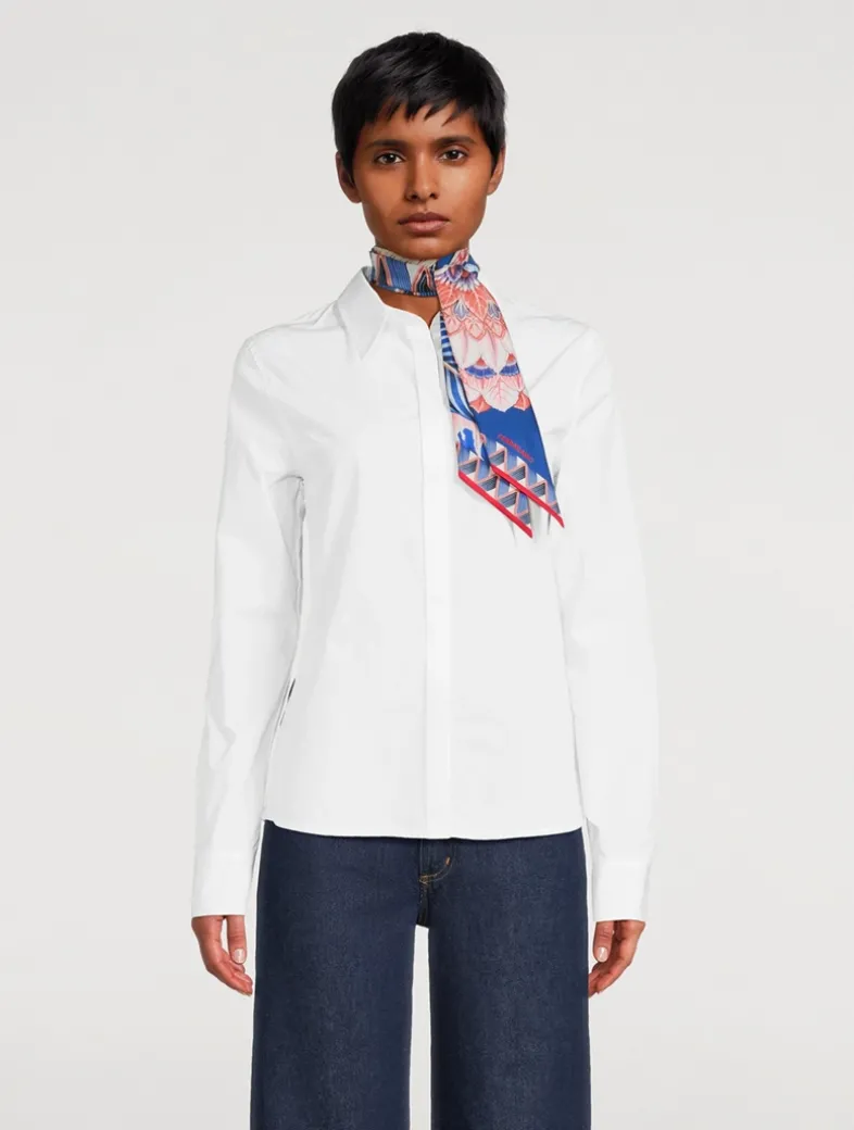 This bandeau scarf showcases the Giada print, combining butterfly and floral patterns with geometric elements on one side and flowing shapes with foliage on the other.
