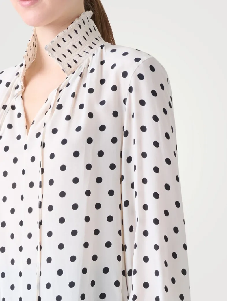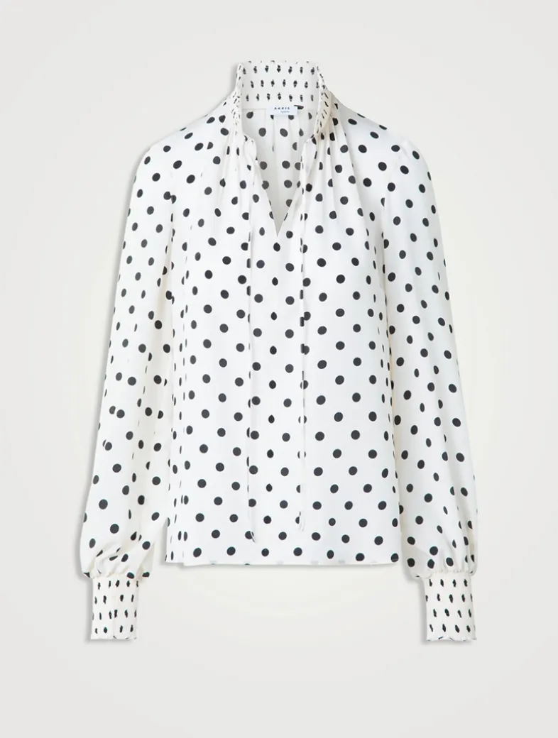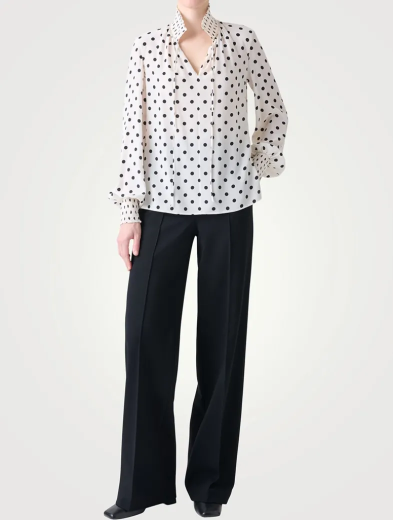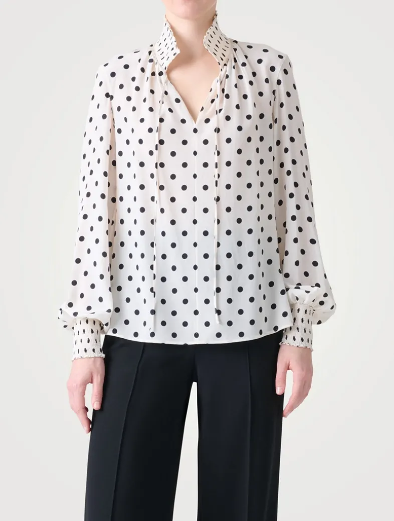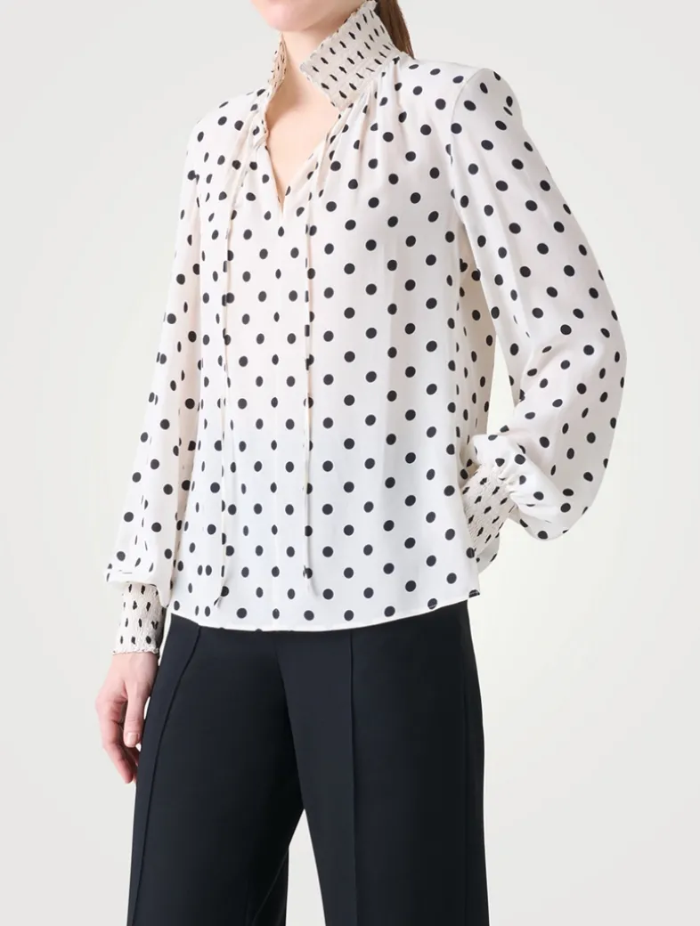 A playful polka dot print adorns this long-sleeve blouse. Crafted from silk crêpe de chine, it has a V-neckline finished with slim knotted ties. A smocked collar and cuffs complete the look.