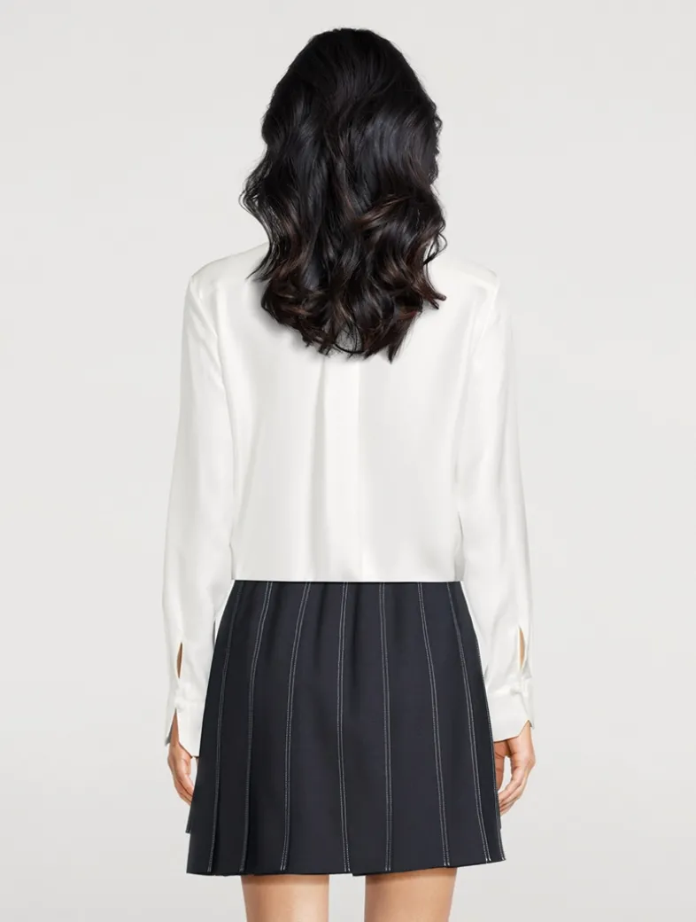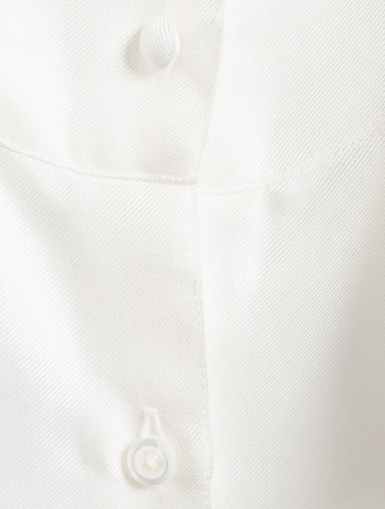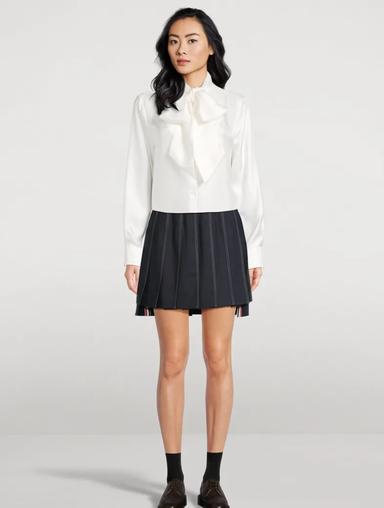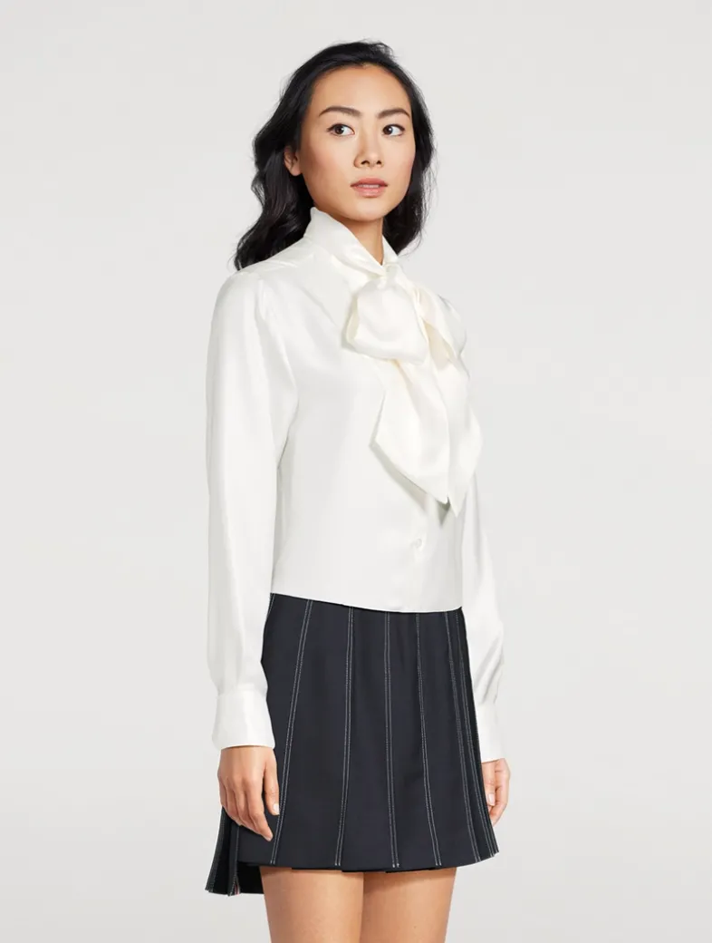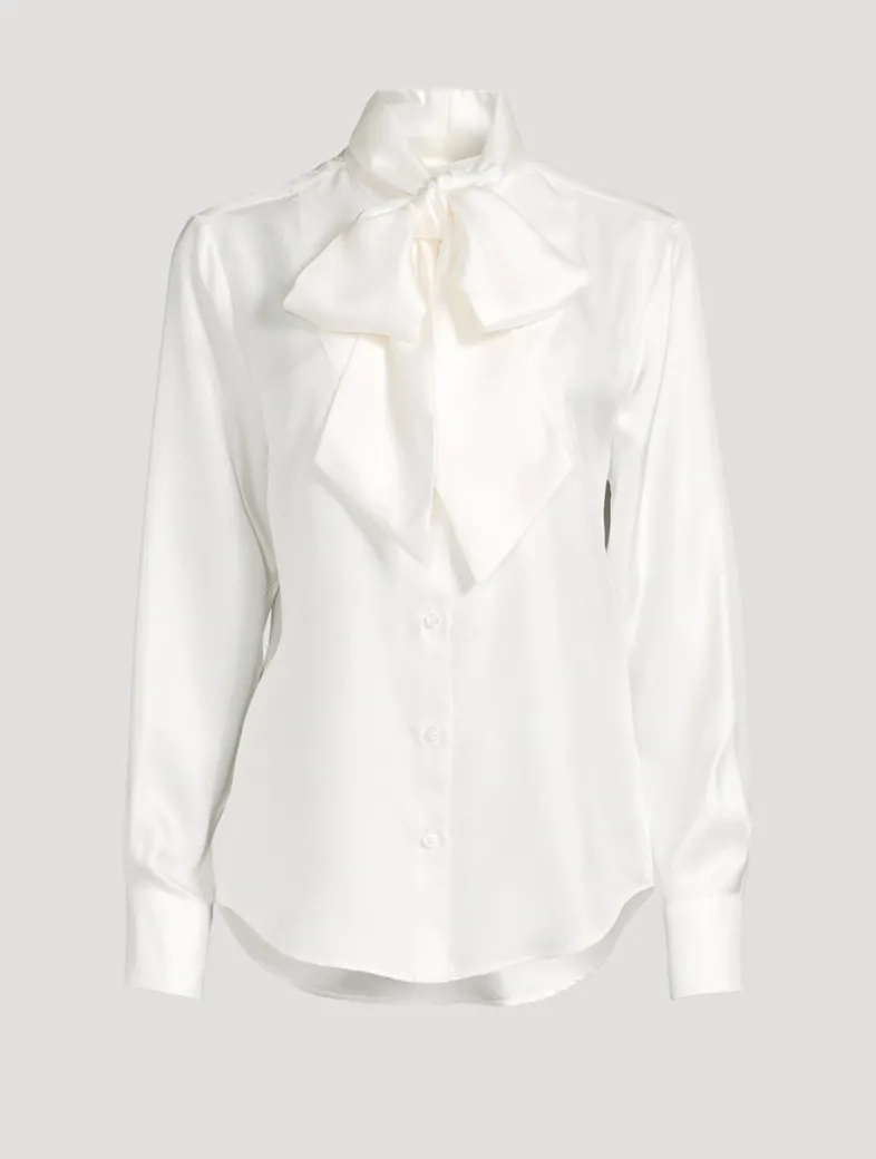 This enchanting piece marries the enduring elegance of classic shirting with an spirited bow for a touch of glamour and sophistication.