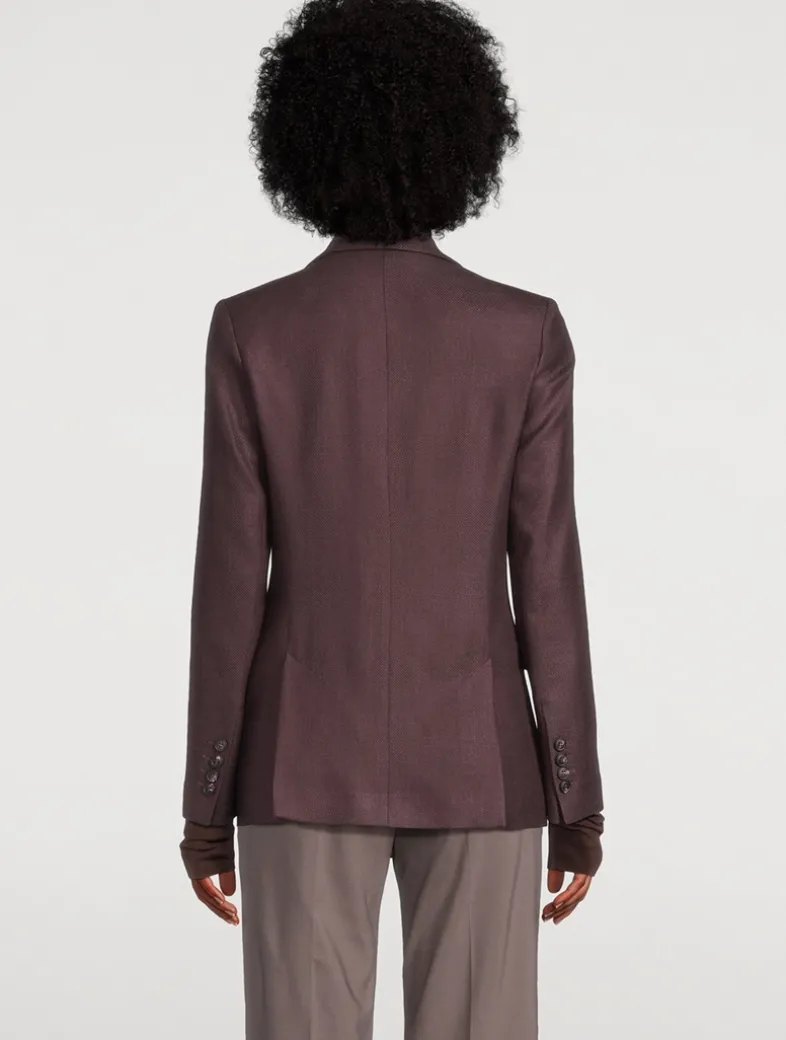 Crafted in Italy, this single-breasted jacket is tailored from a fine blend of wool, silk, and linen, enhanced by a diagonal weave that creates a striking three-dimensional effect.