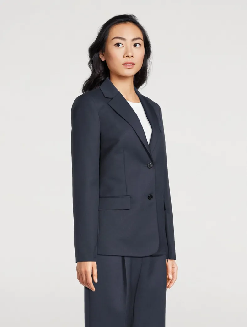 This blazer goes from day to night in a strong, feminine silhouette featuring peak lapels, a buttoned front, and flattering nipped-in waist. It is crafted from a blend of wool and recycled fibres and cut to a tailored shape. Certified to the Responsible Wool Standard (RWS).