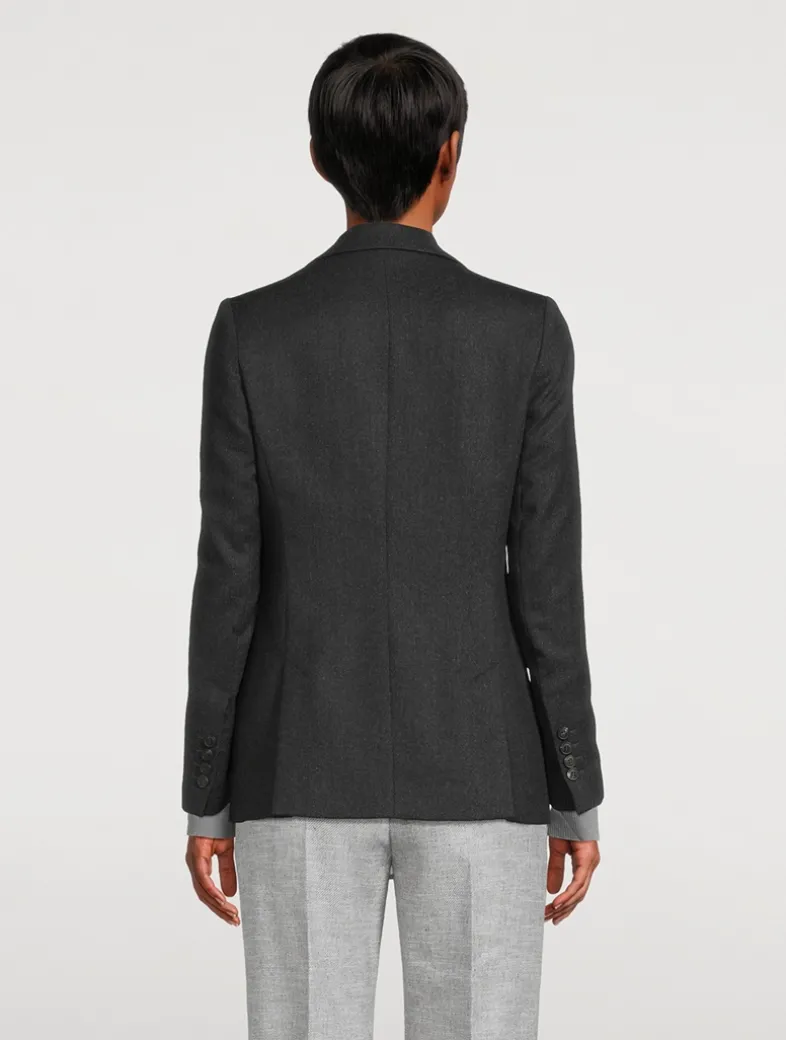 Single-breasted jacket made from a very fine wool blend. This garment is enhanced by the addition of high quality lurex thread, making it distinctly more feminine and suitable for formal occasions.