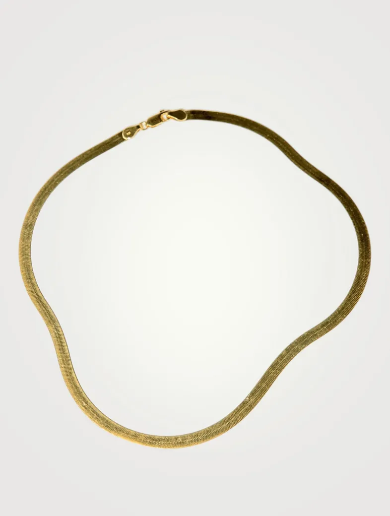 The Sleeping Venus necklace is a timeless and elegant herringbone chain, crafted from 24K gold-plated sterling silver, that glides and dips along the collarbone like liquid gold with every movement.