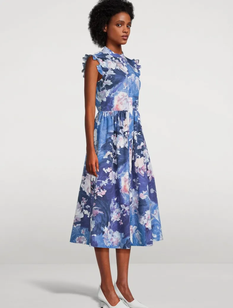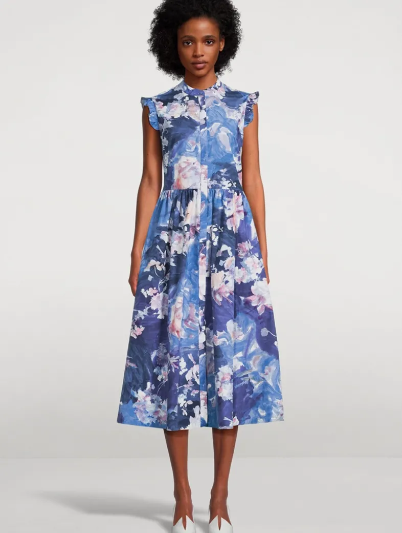 Featuring delicate hand-drawn motifs created by British contemporary artist Kaye Donachie, this mid-length dress is made from heavyweight white cotton poplin, and features hidden side seam pockets. Embellished with a large-scale floral print throughout, this fit and flare, A-line midi dress is finished with a stand collar, frilled sleeves, and a fitted waist.