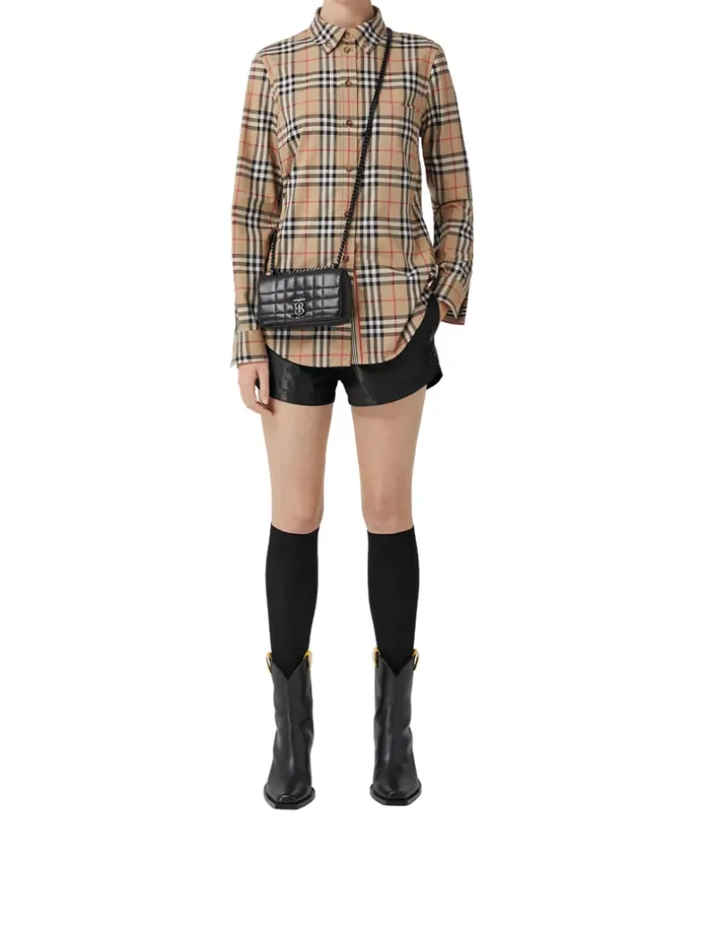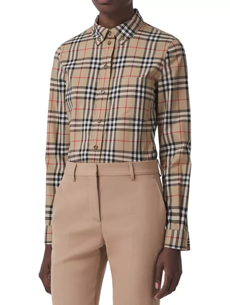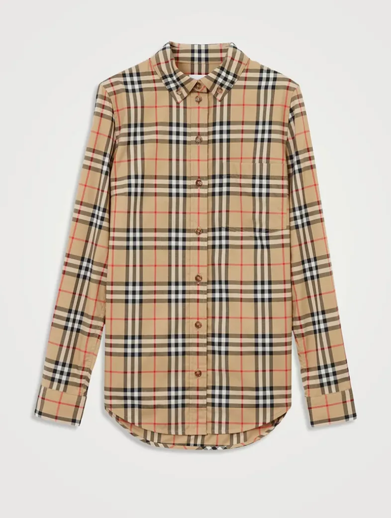 A shirt in stretch cotton twill woven with the Burberry Check. The design is cut to a slim fit and features a grosgrain Icon stripe ribbon concealed at the placket and cuffs.