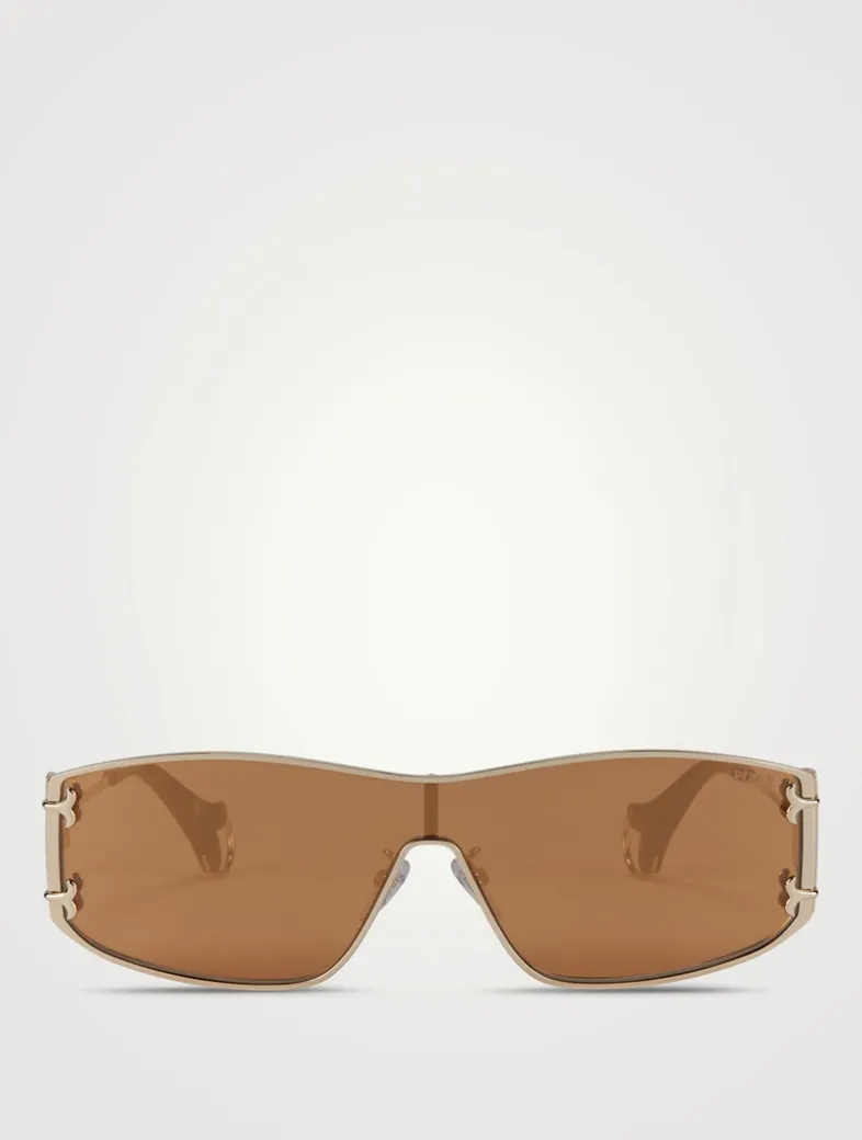 These narrow mask sunglasses are designed with a metal shield shape, and signature intertwined fish cut-out at the temples.