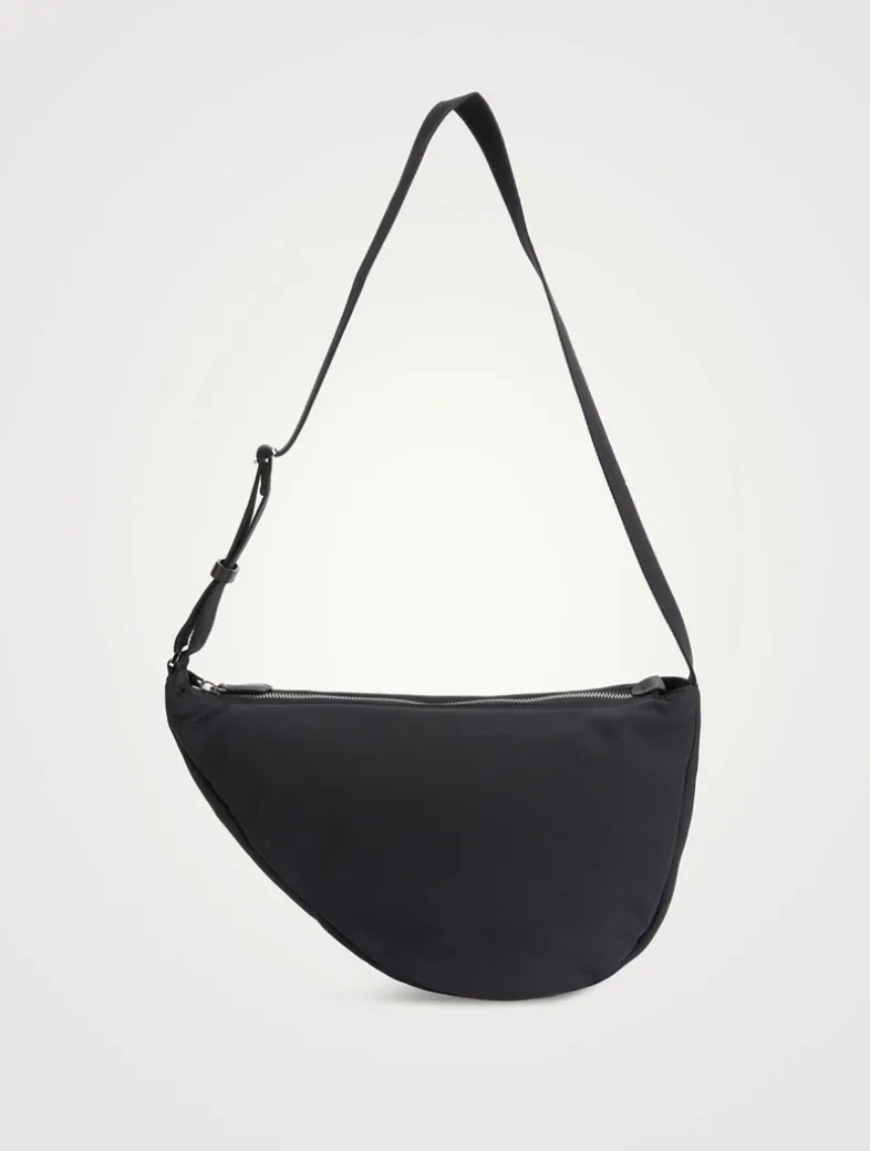 Designed in a curved shape, this spacious nylon bag features an adjustable webbing shoulder strap for crossbody wear. Trimmed with leather.