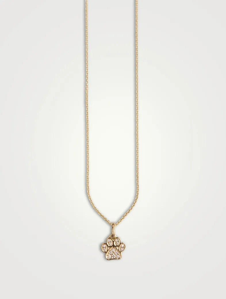 This necklace features a small dog paw print charm crafted from 14k gold and accented with sparkling diamonds. Suspended on a fine 14k gold cable chain, it offers an adjustable length of 16