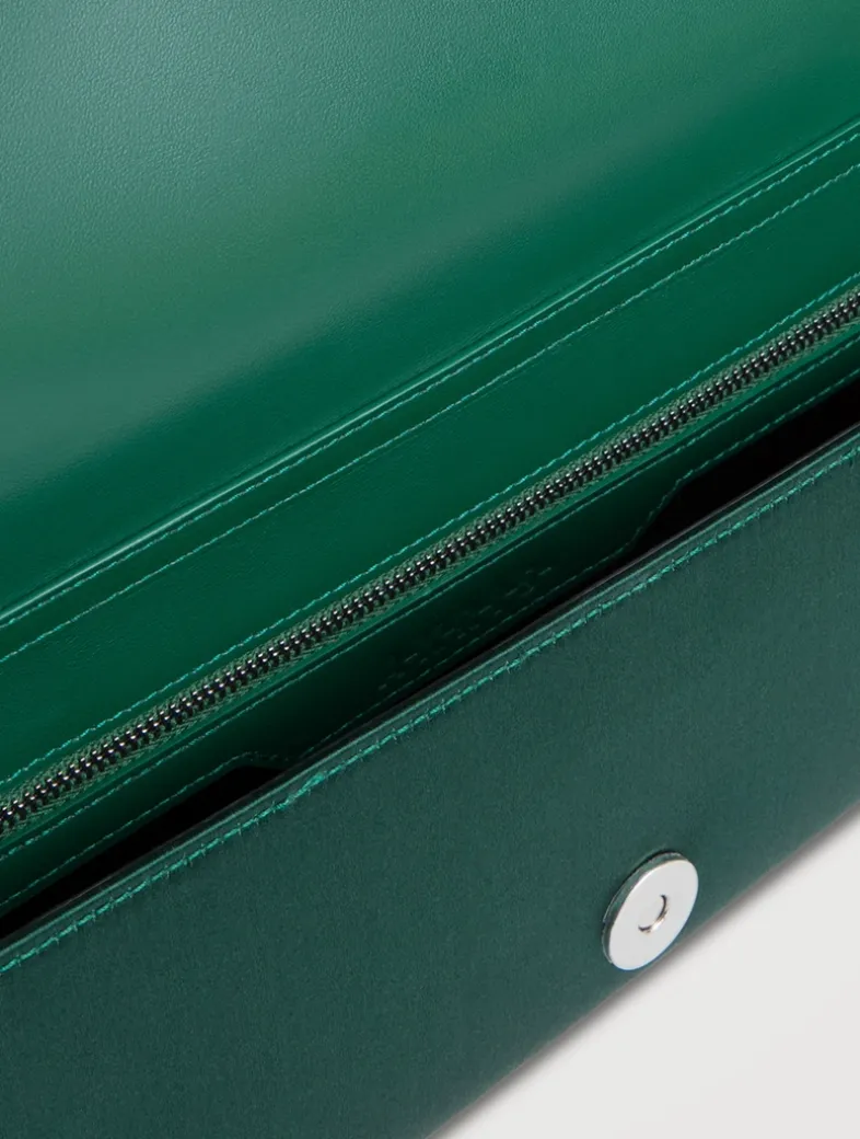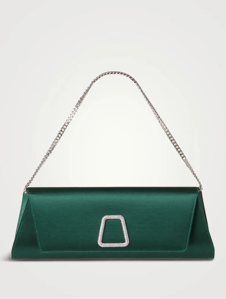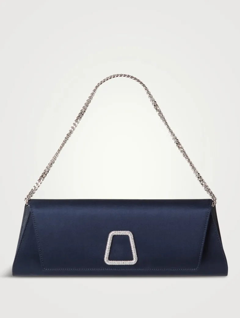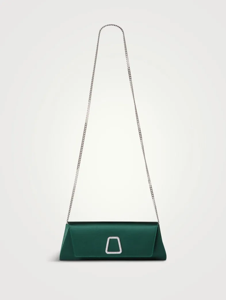 The perfect companion for your evening looks. This leather-trimmed clutch is crafted from luxe satin embellished with signature trapezoid crystal-encrusted hardware. Carry it by hand or wear it over the shoulder using the detachable chain strap. It has one main compartment with an interior zip pocket.