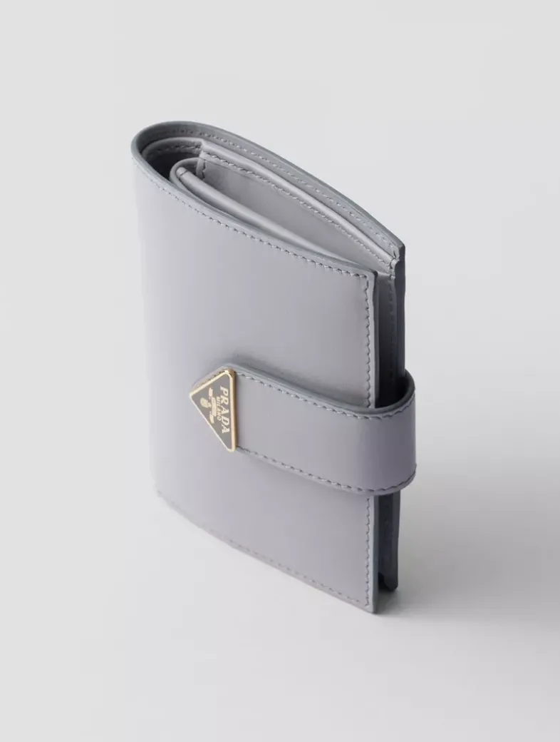 Snap closure Enameled metal triangle logo One bill compartment Three card slots Two internal pockets Coin compartment with flap Moiré and leather lining