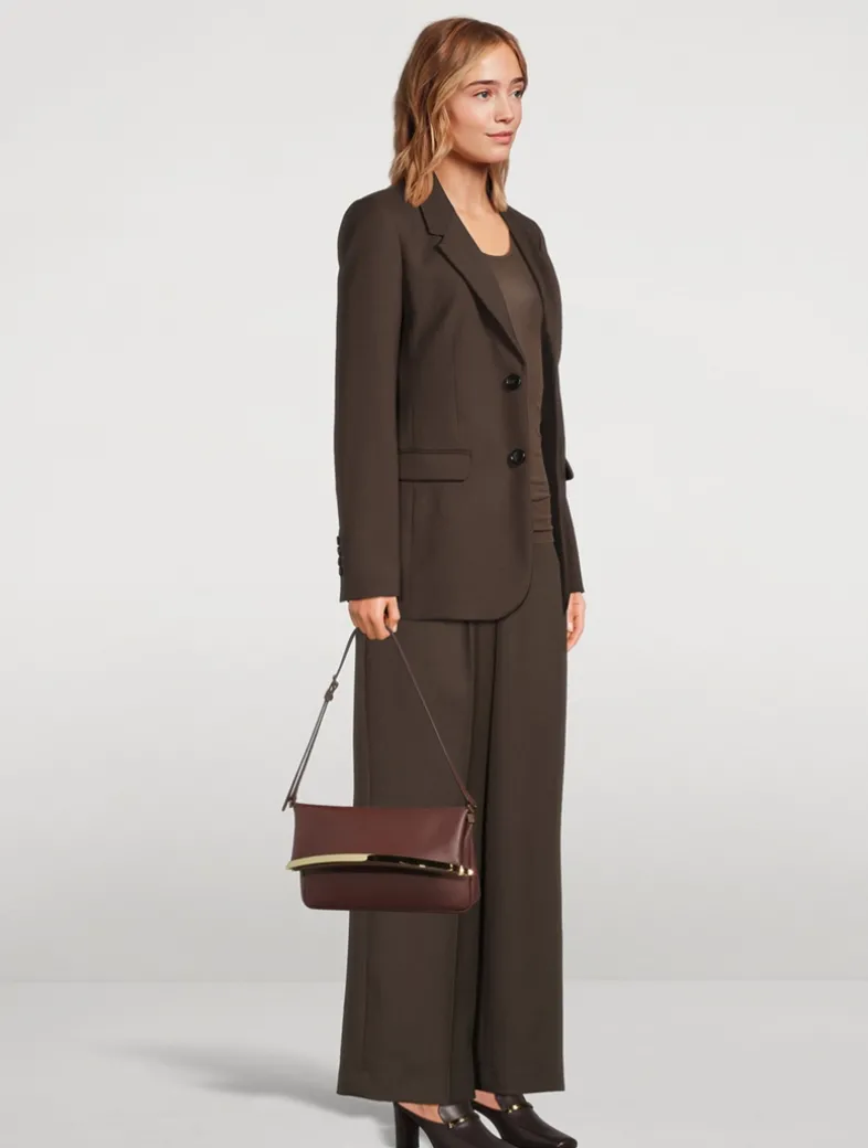 An elegant metal bar is the closing element of this shoulder bag with minimal lines. This style’s shape is emphasized by a precious calfskin leather. Featuring an adjustable handle, it comes with s practical zip under the flap with access to the internal pocket.