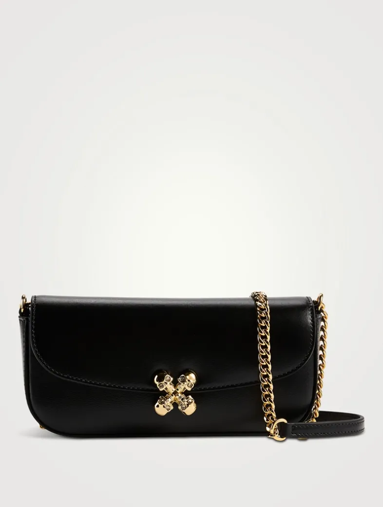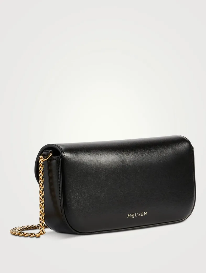 Made in Italy, this elongated east-west silhouette is crafted from supple calf leather. It has a rounded flap with crystal-embellished McQueen Skull Flower motif. The bag can be worn across the body using the leather and chain strap.