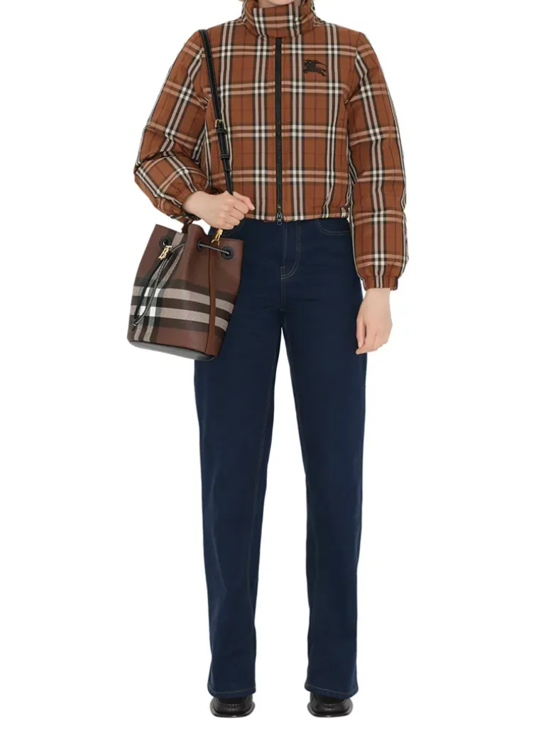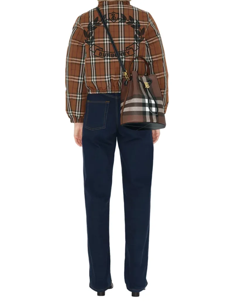 A drawcord bucket bag made in Italy from Burberry Check.The softly structured shape is lined in a cotton blend and features a Thomas Burberry Monogram. Carry by the top handle or wear as a crossbody bag using the detachable strap.