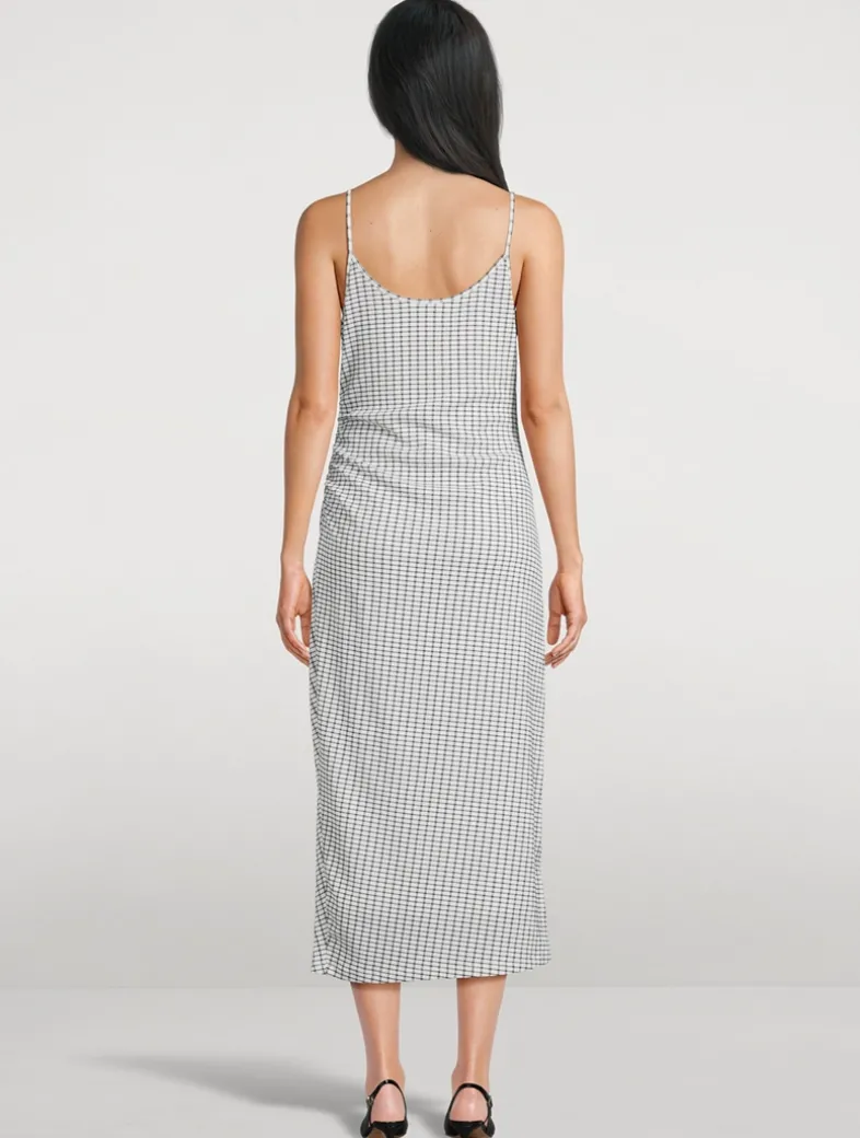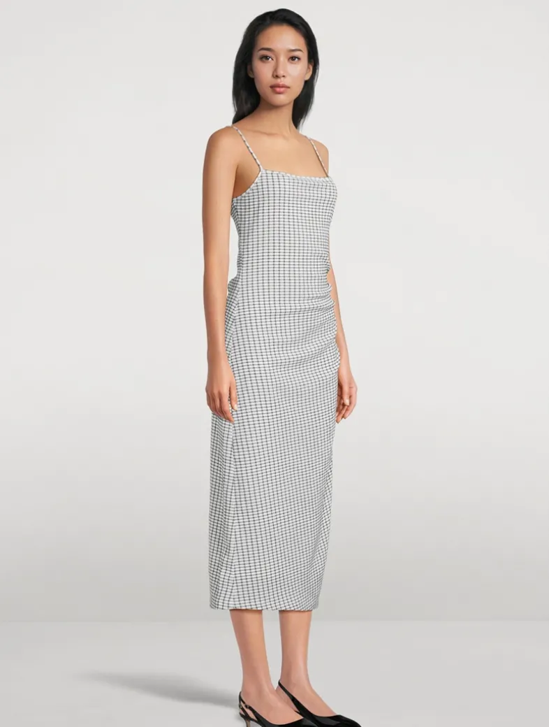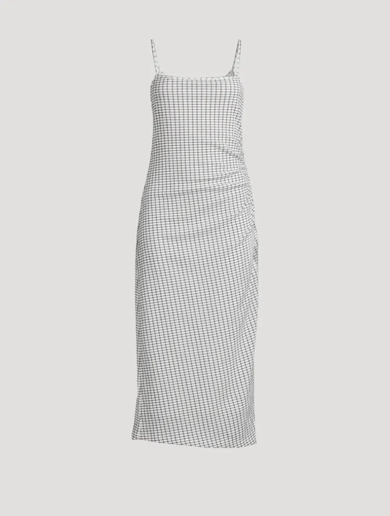 Stretchy smocking and a checked pattern lend this classic tank dress its texture and dimension, while gentle ruching at the waist softly frames the form.