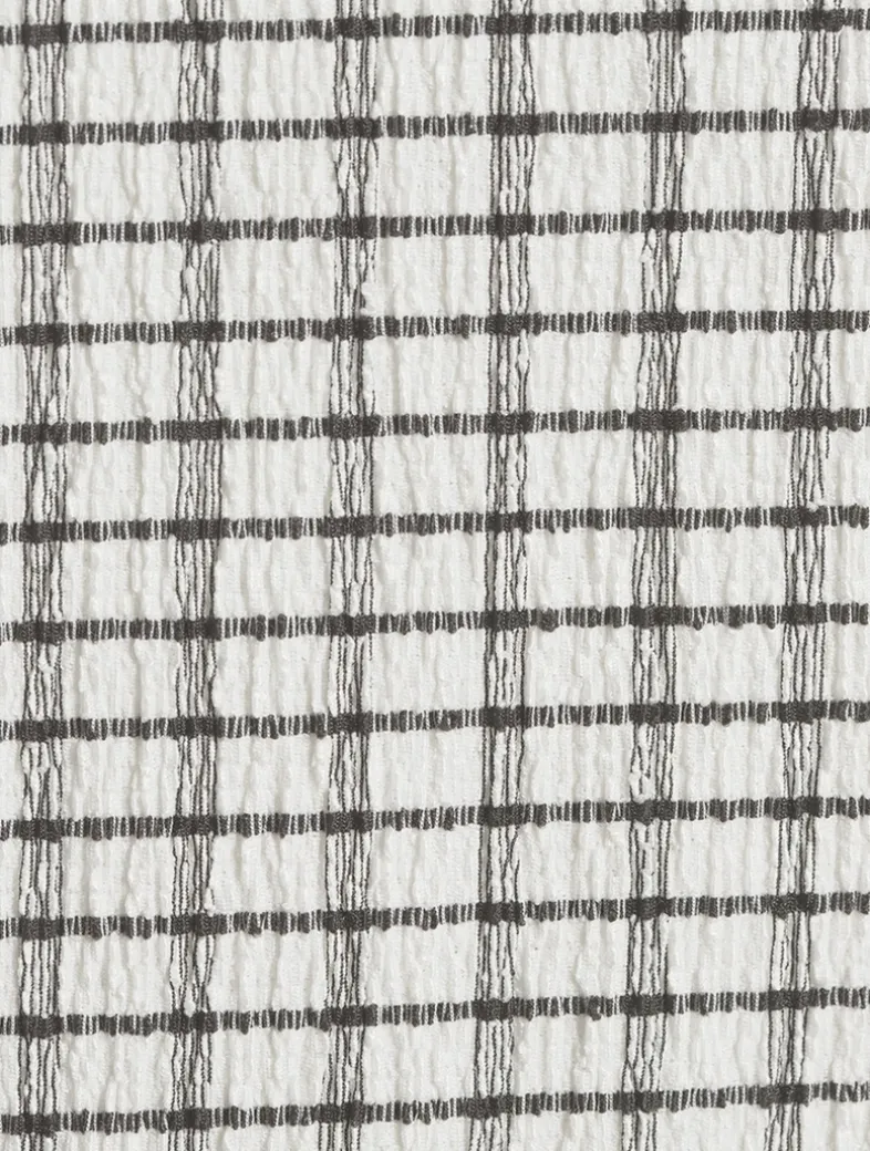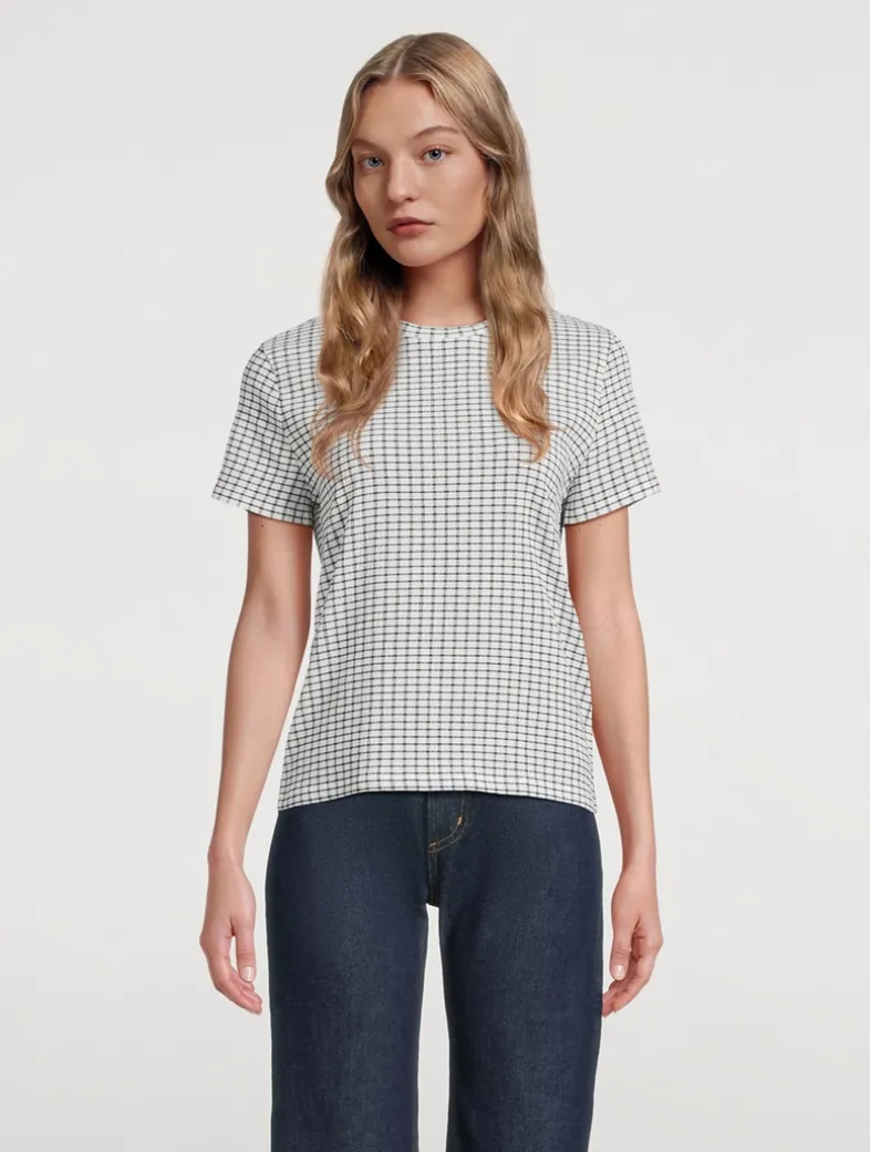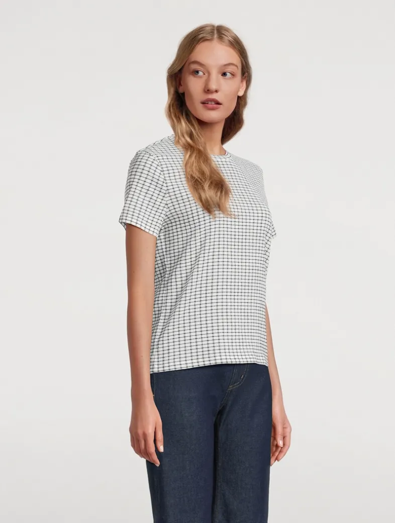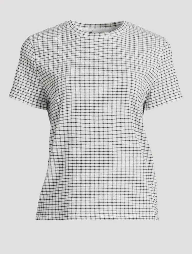 Stretchy smocking and a checked pattern lend this classic crewneck its texture and dimension.