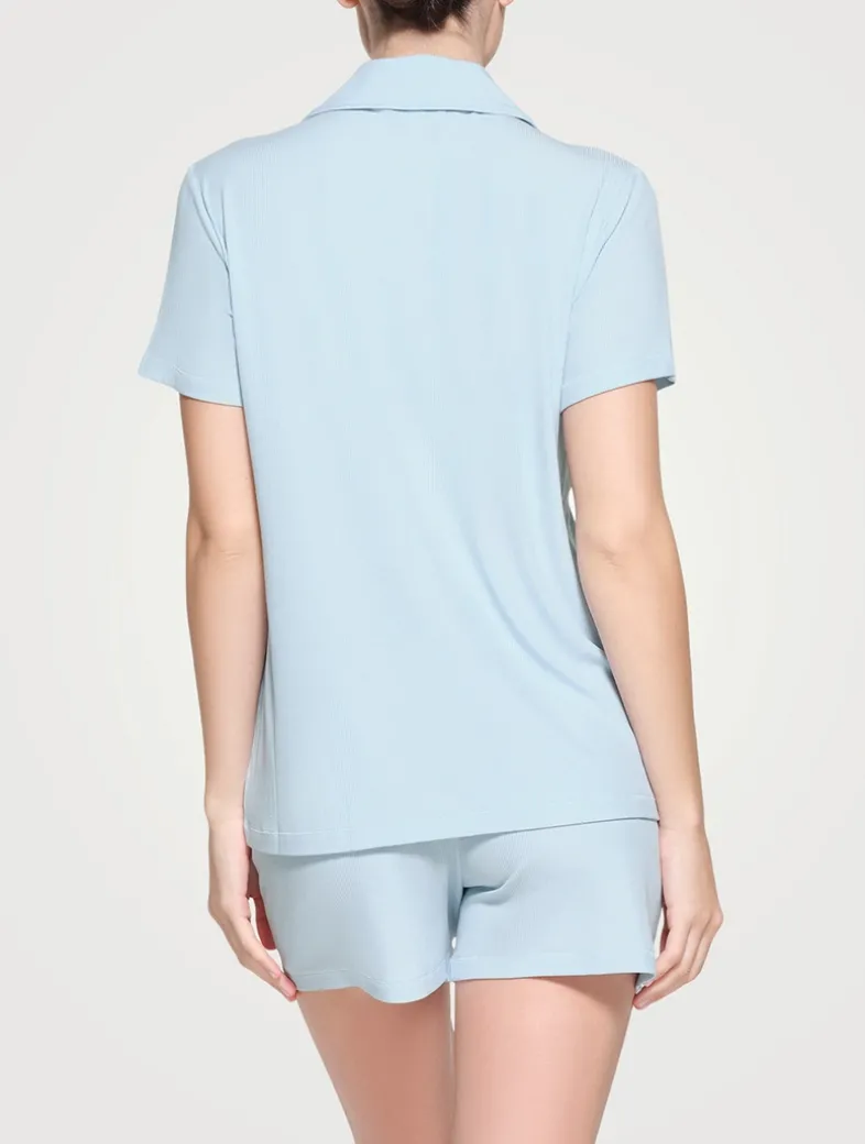 Meet the ultra-soft sleep set of your dreams. This classic button-up sleepwear top and fitted shorts have a classic look and ultra-comfortable feel. Features chest pocket details and interior drawstrings. Fits true to size.
