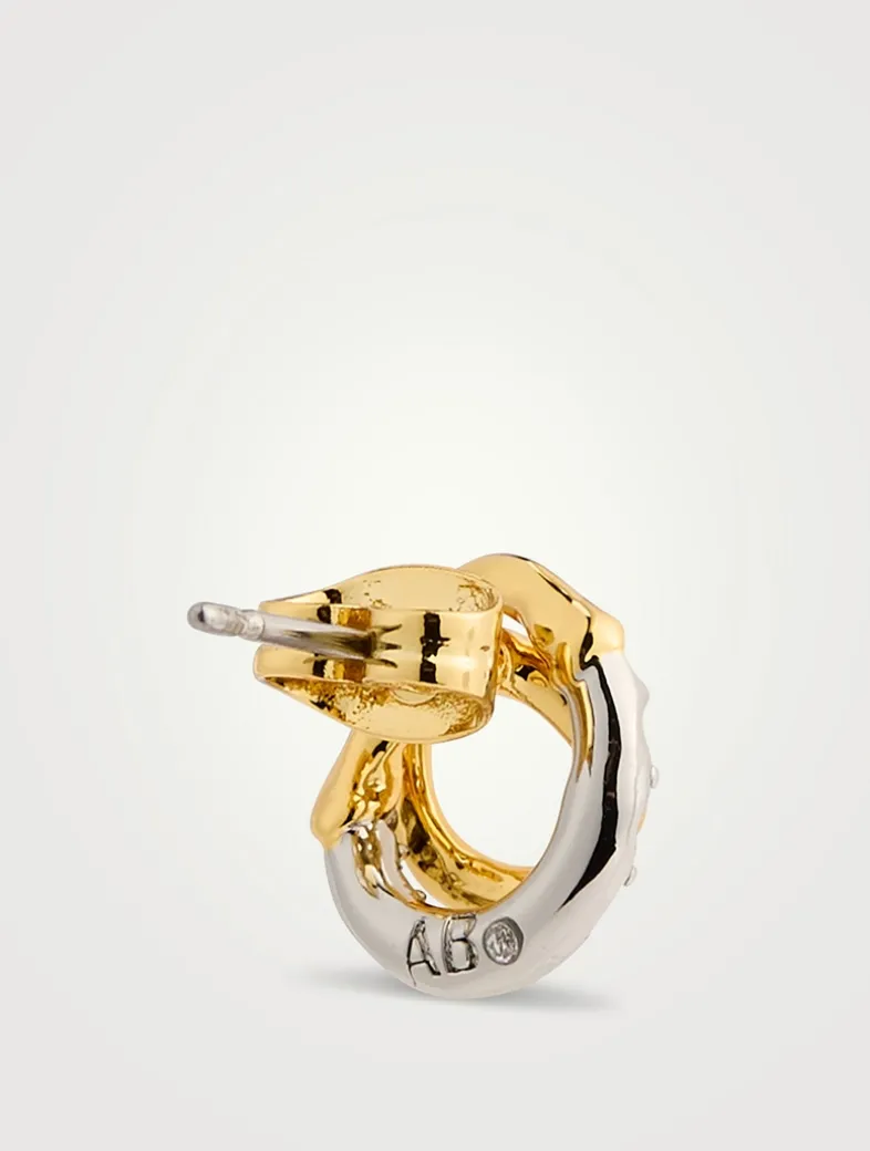 Small in size yet meticulously detailed, these petite 14k gold plated stud earrings have a spiraling liquid gold silhouette, accented with silver tone plated crystal pavé.