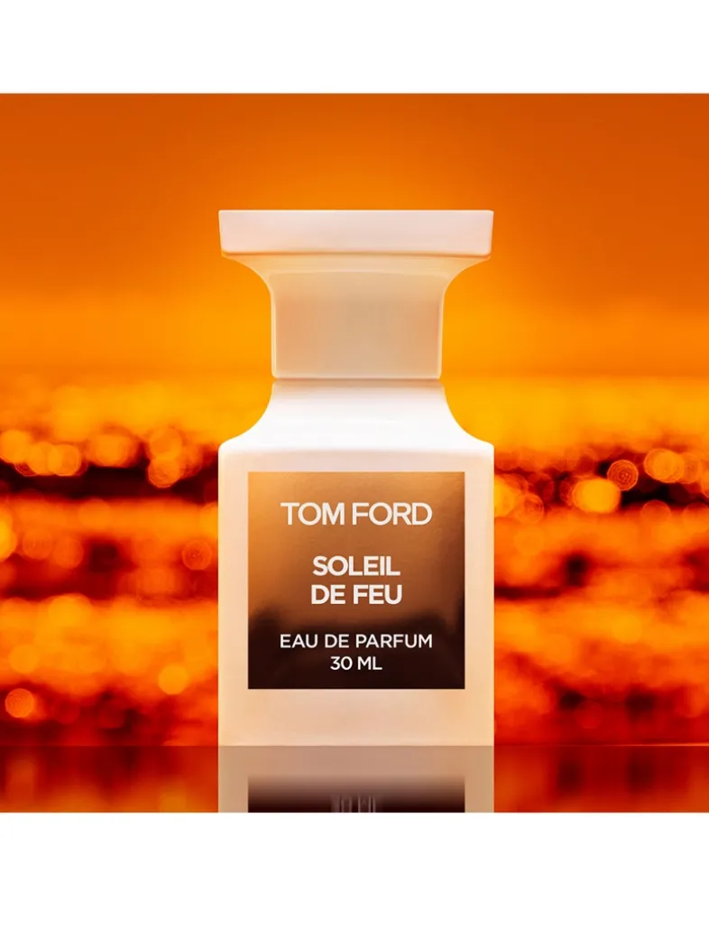 The amber woody scent evokes the molten sun descending in a burnished blaze over the sea, painting the sky with fiery strokes of bronze solar light. Inspired by bronze strokes of fiery sunset light, new SOLEIL DE FEU captures a burnished sensuality with tuberose accord, warm ambers, and exotic sandalwood.
