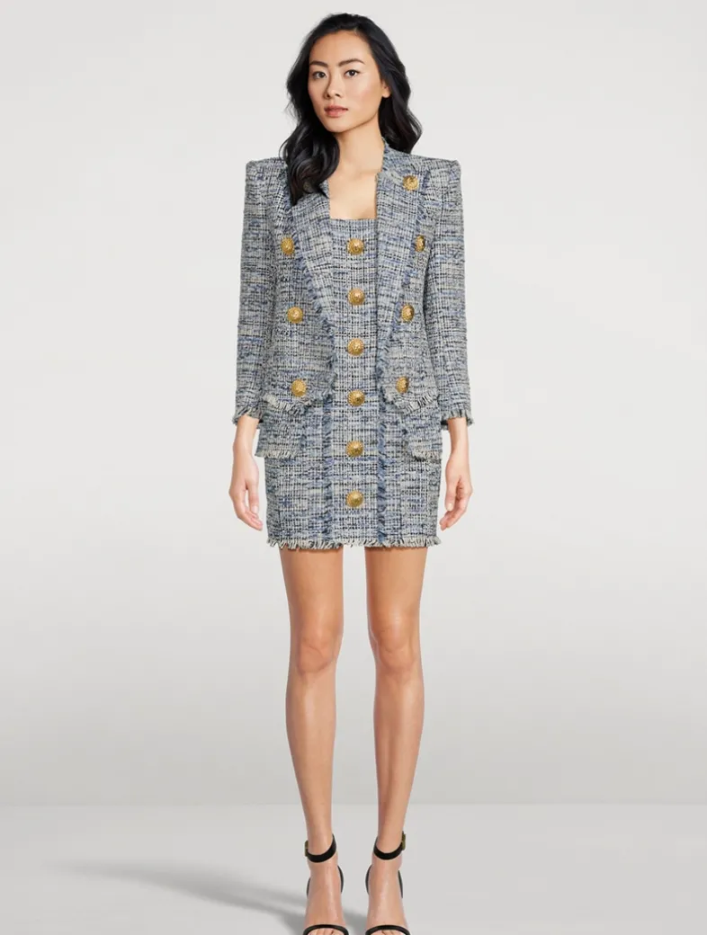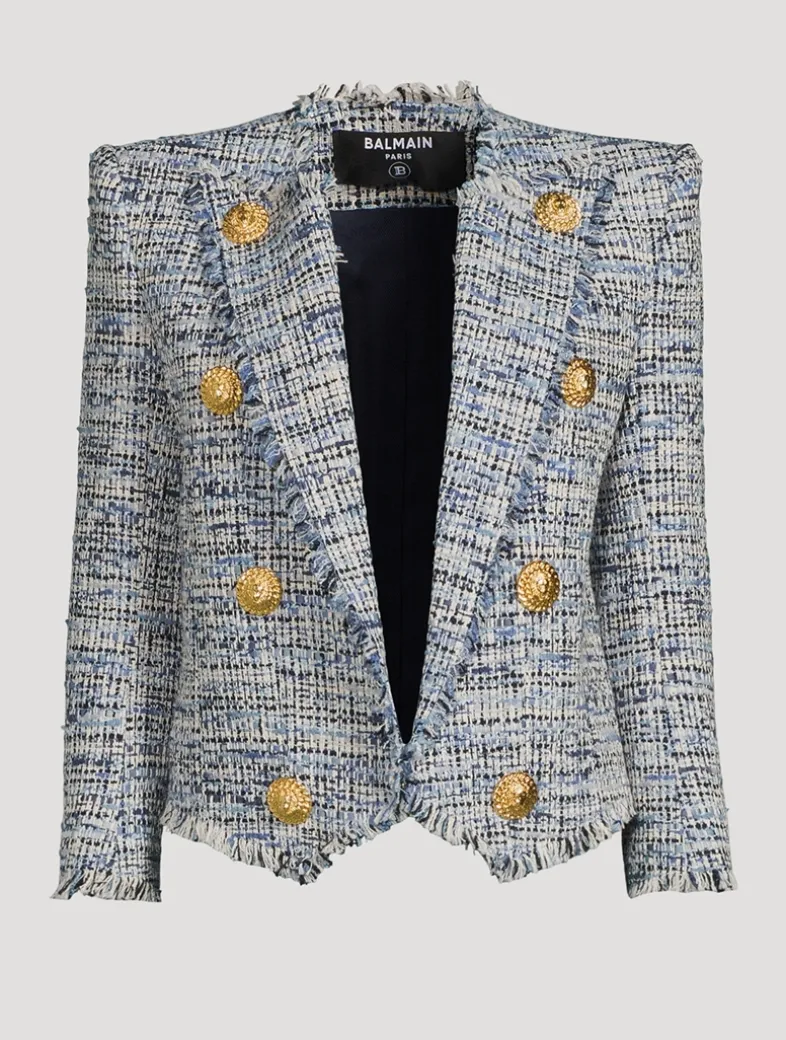 Crafted in a textured cotton-blend tweed highlighted with fringe edges, this collared jacket is cut in a tailored silhouette. It is embellished with Balmain’s signature embossed gold-tone buttons.